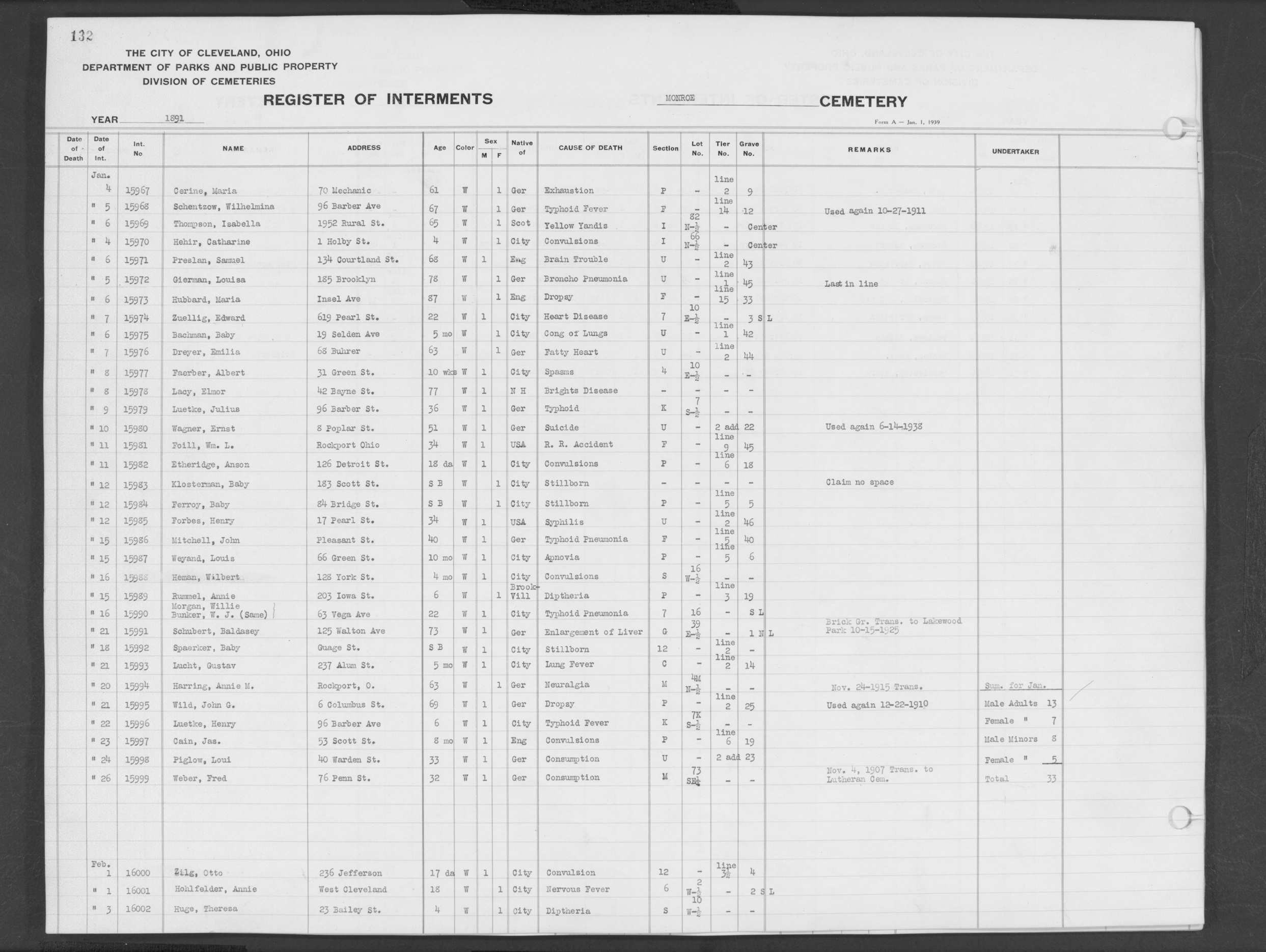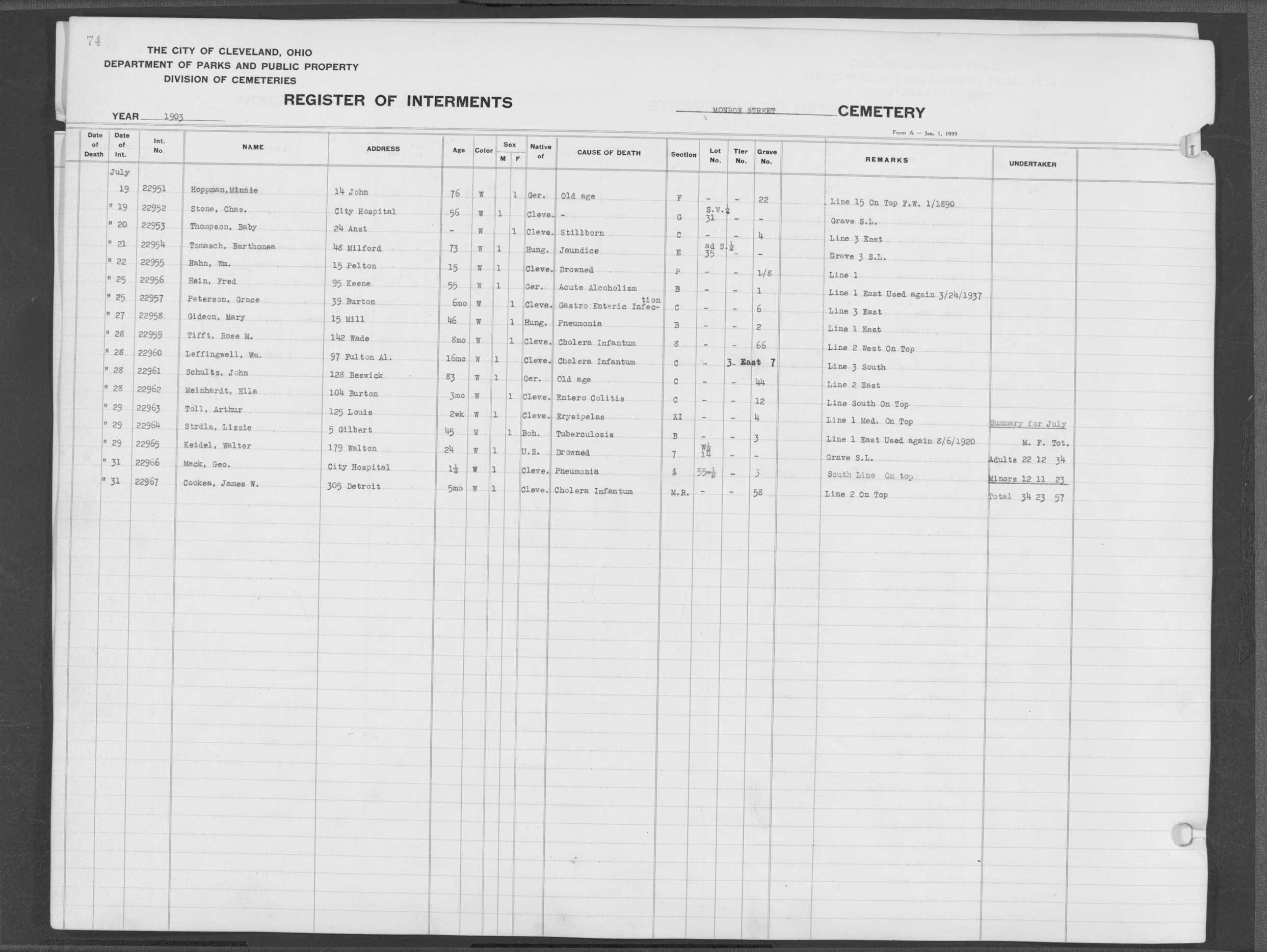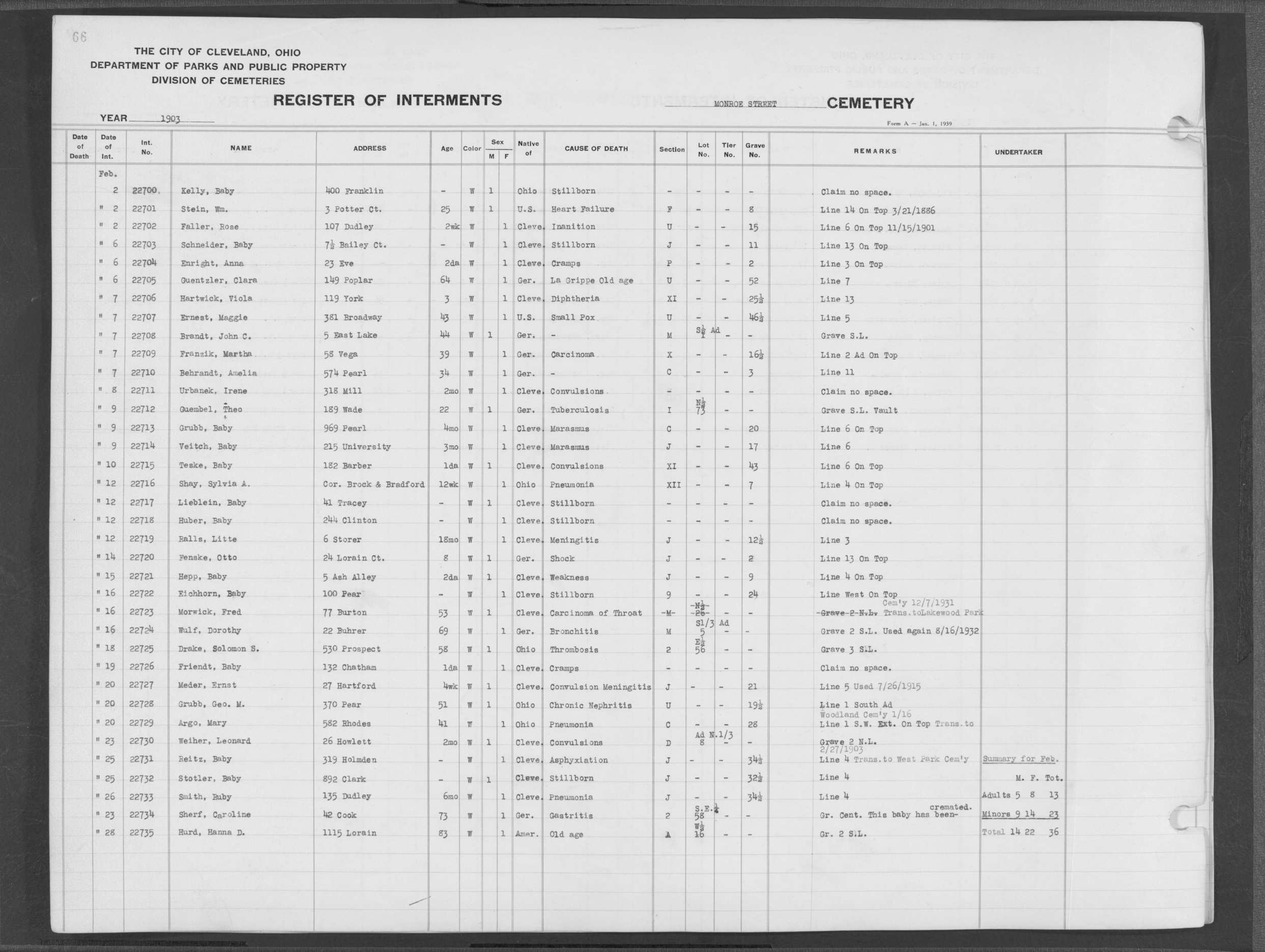 | Monroe Street | 3 | 66 | Feb | 23 | 1903 | 22734 | Sherf, Caroline | 73y | W | F | ||||
