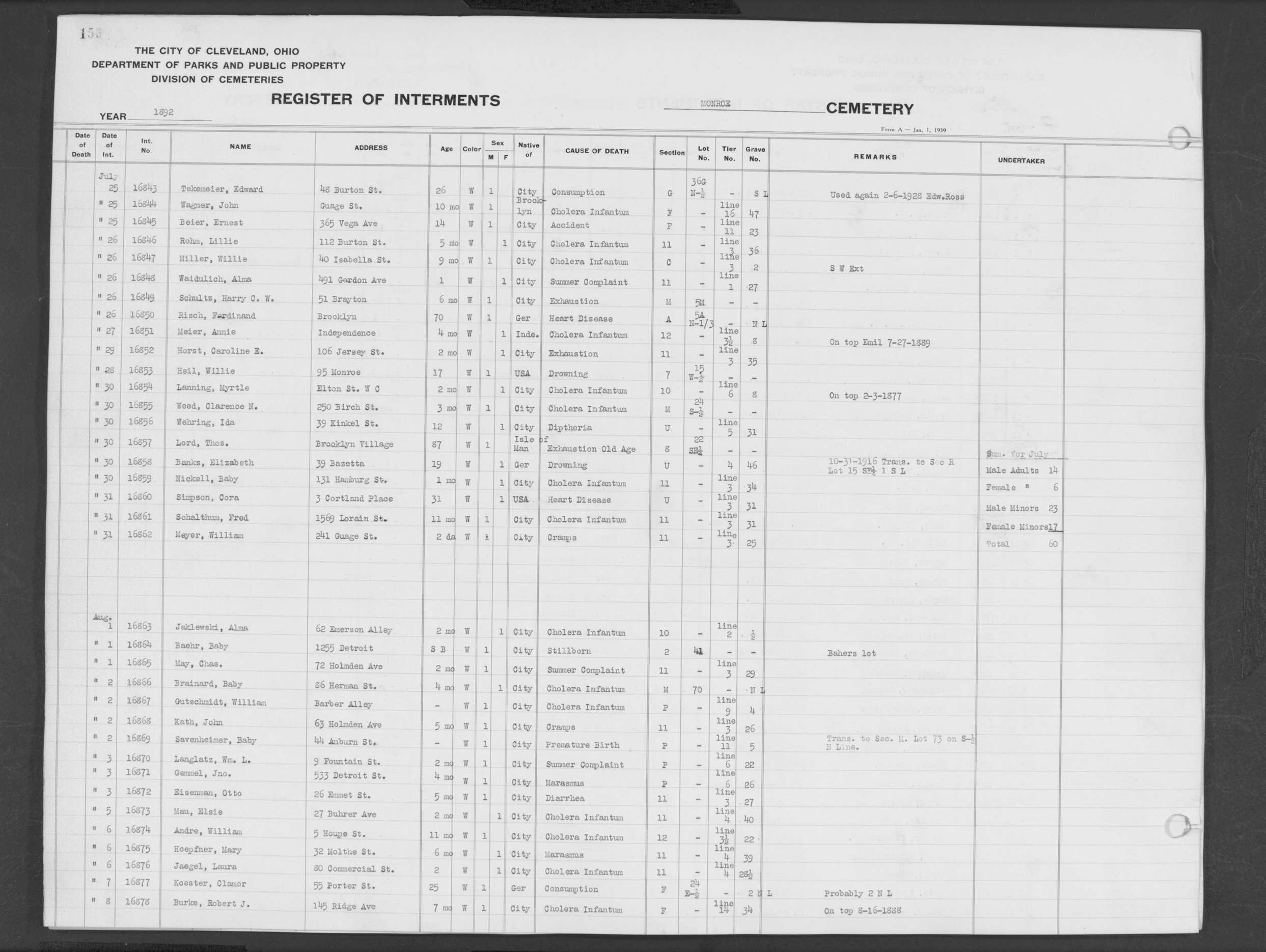 | Monroe Street | 2 | 157 | Aug | 12 | 1892 | 16889 | Shafer, Christina | 68y | W | F | ||||