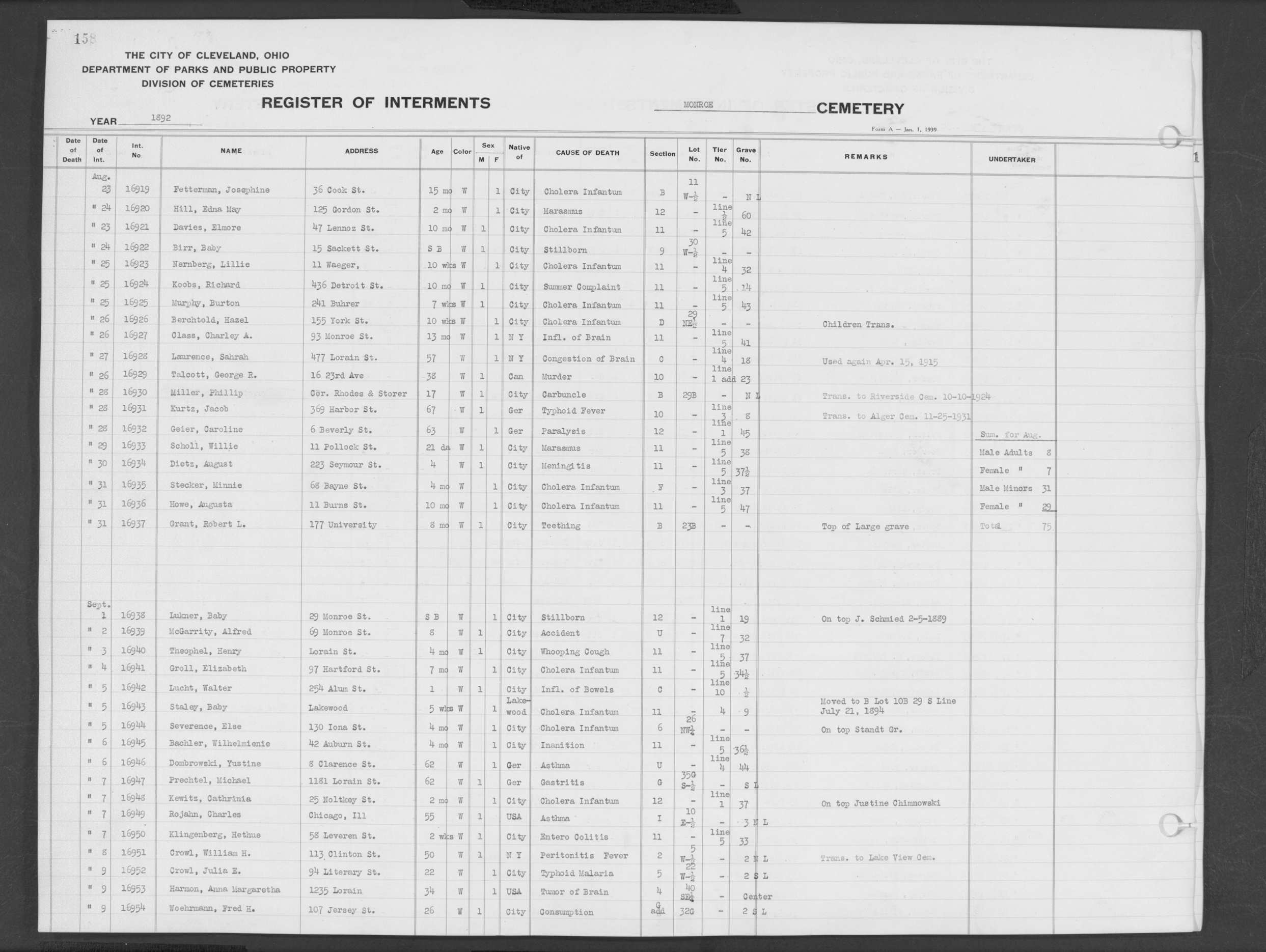 | Monroe Street | 3 | 102 | Aug | 13 | 1905 | 23891 | Shaw, Sarah | 3m | W | F | ||||