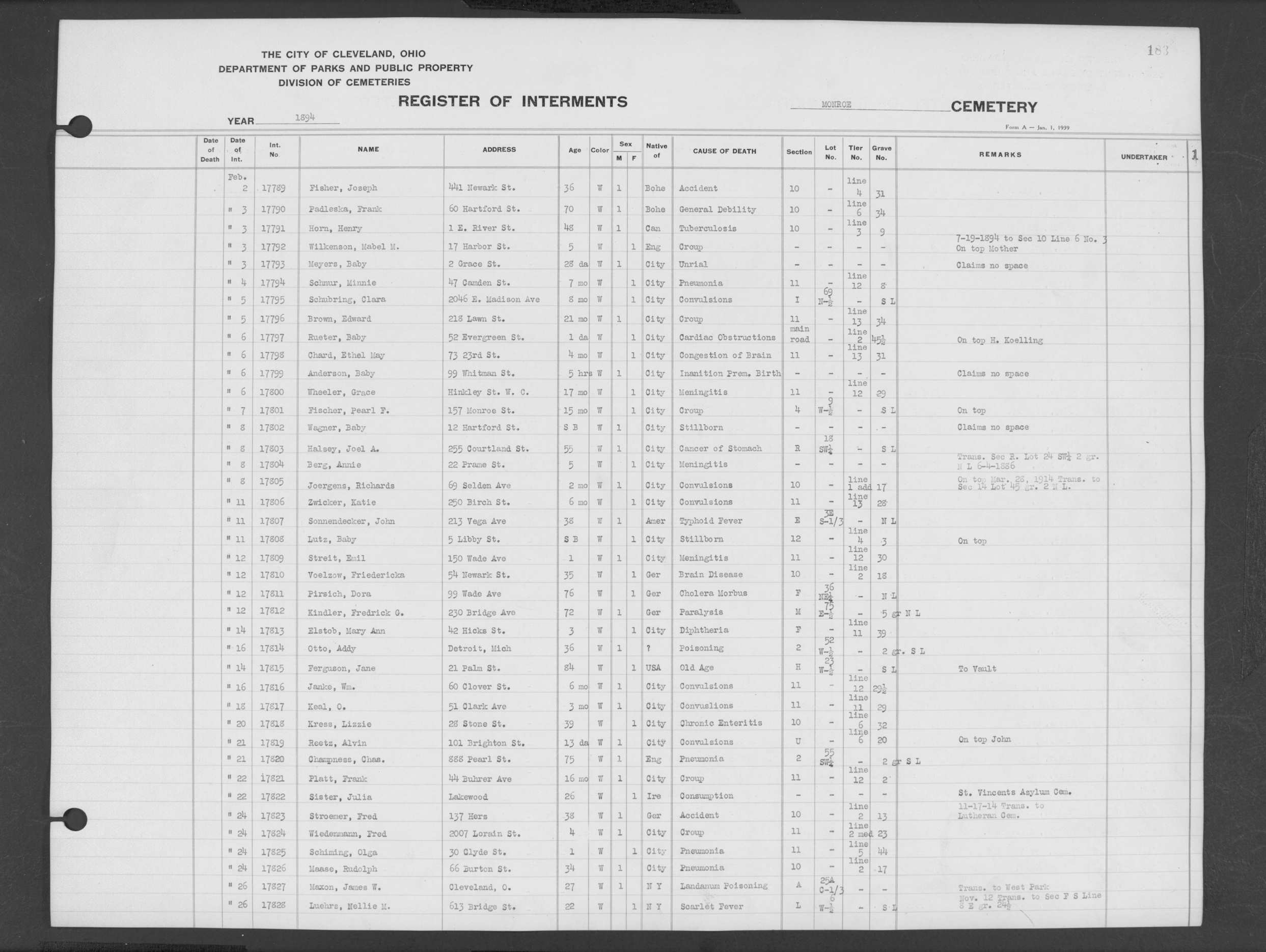 | Monroe Street | 2 | 166 | Feb | 24 | 1893 | 17198 | Shere, Wm F | 9d | W | M | ||||