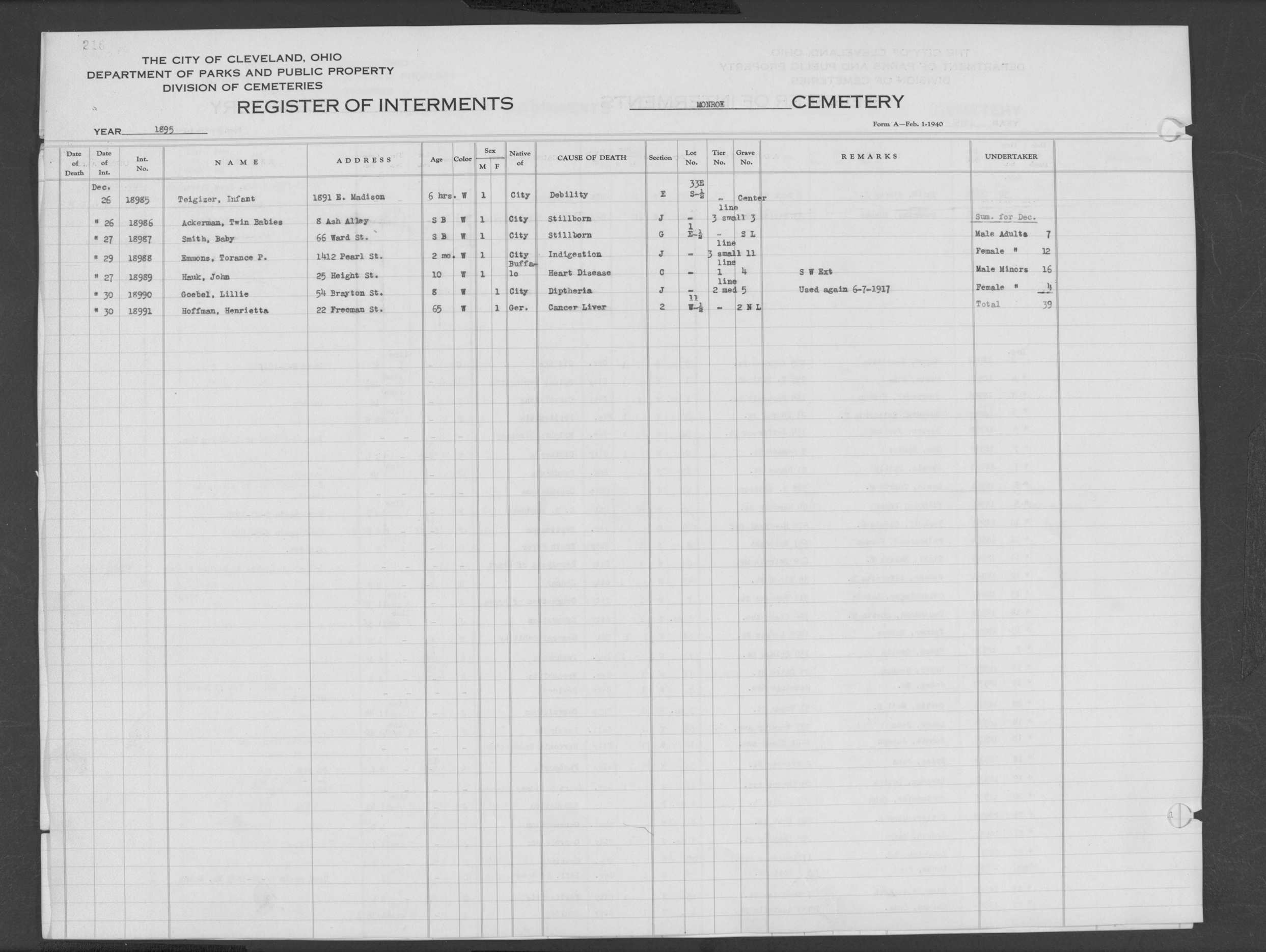 | Monroe Street | 2 | 202 | Feb | 11 | 1895 | 18496 | Swayer, Nellie | 40y | W | F | ||||