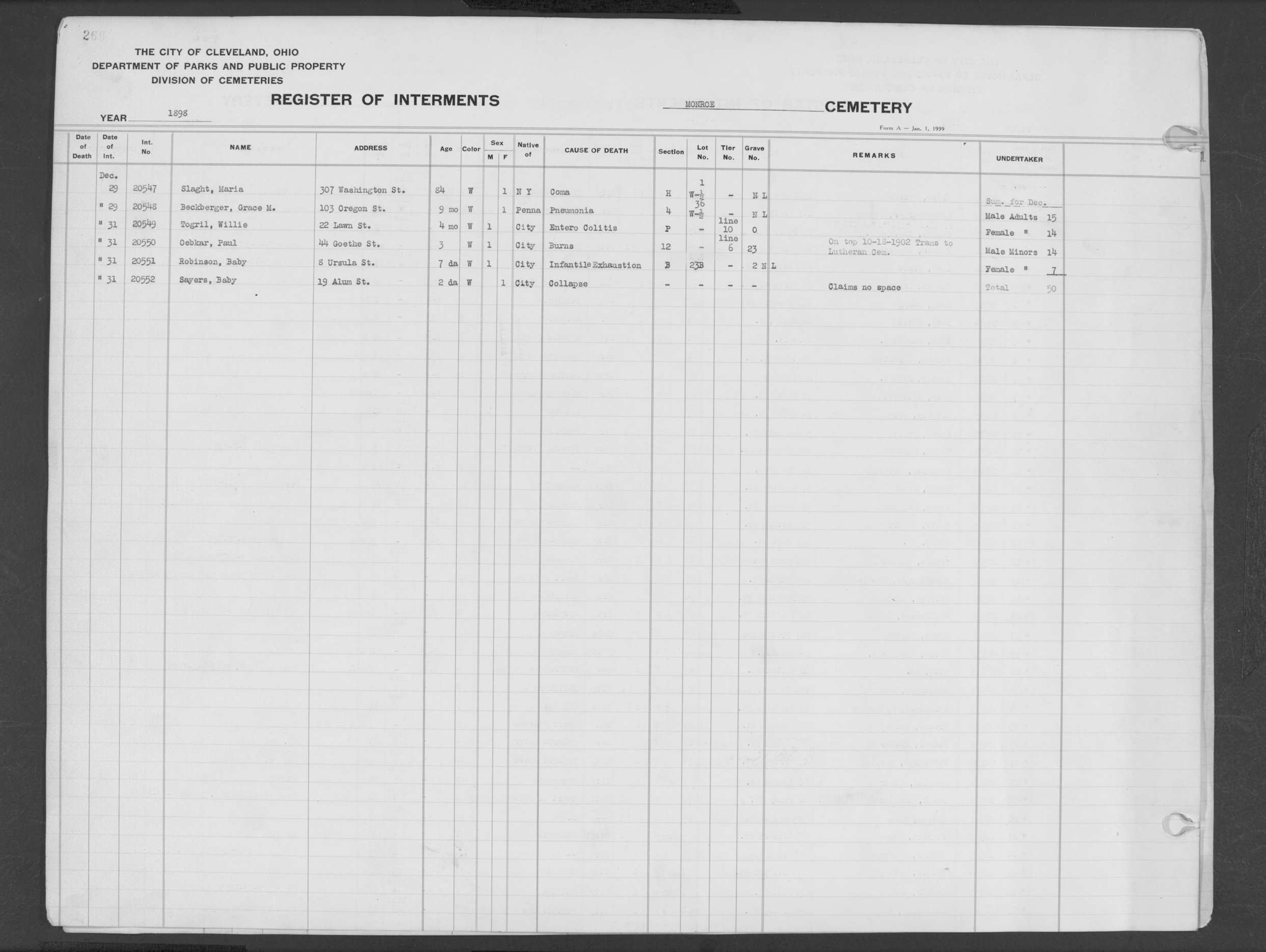 | Monroe Street | 2 | 257 | Nov | 8 | 1898 | 20470 | Sharp, Wm | 48y | W | M | ||||