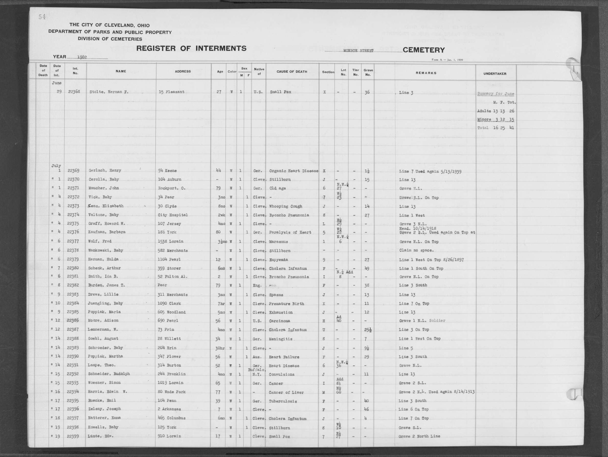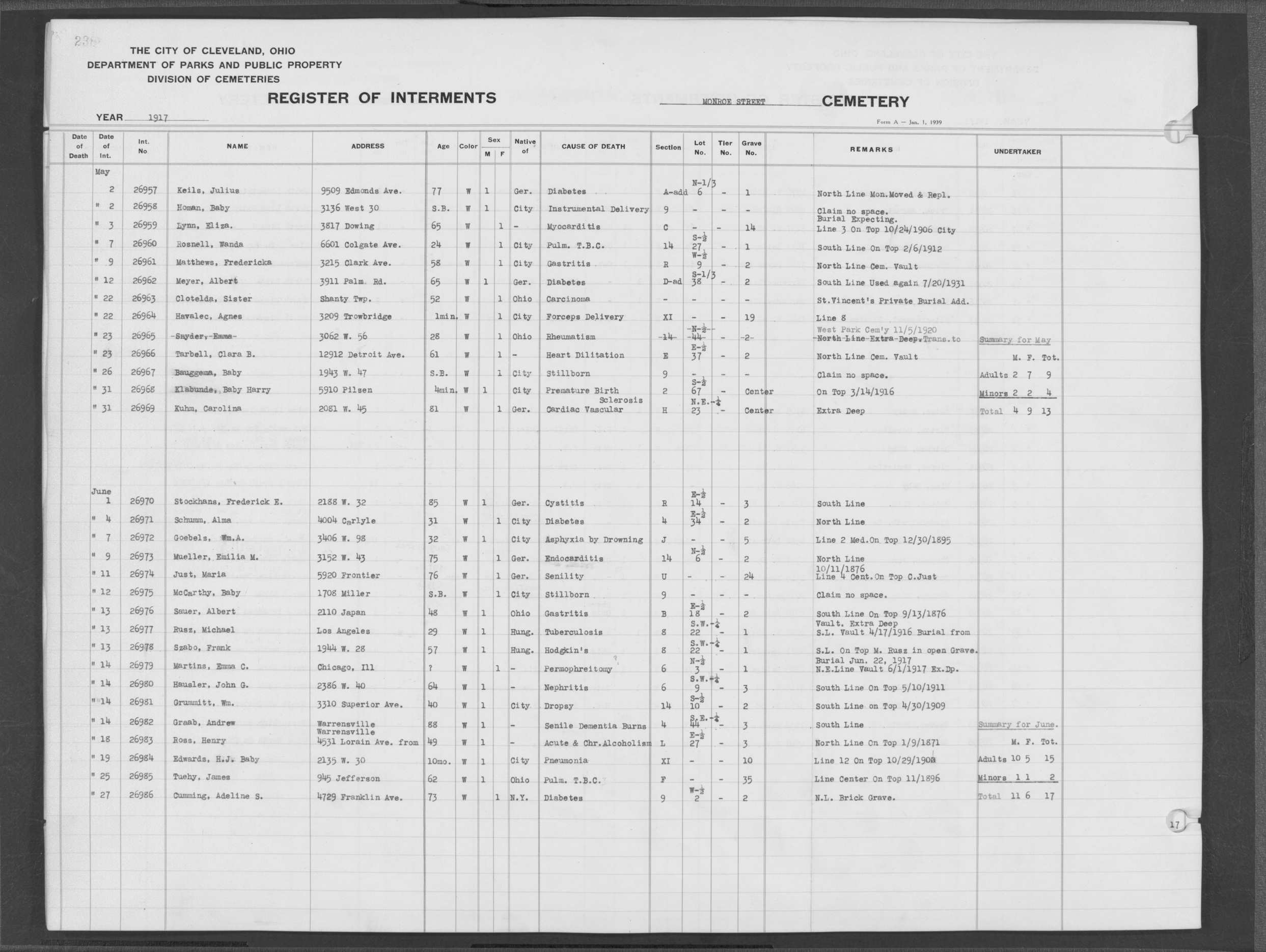 | Monroe Street | 3 | 238 | Jun | 13 | 1917 | 26978 | Szabo, Frank | 57y | W | M | ||||