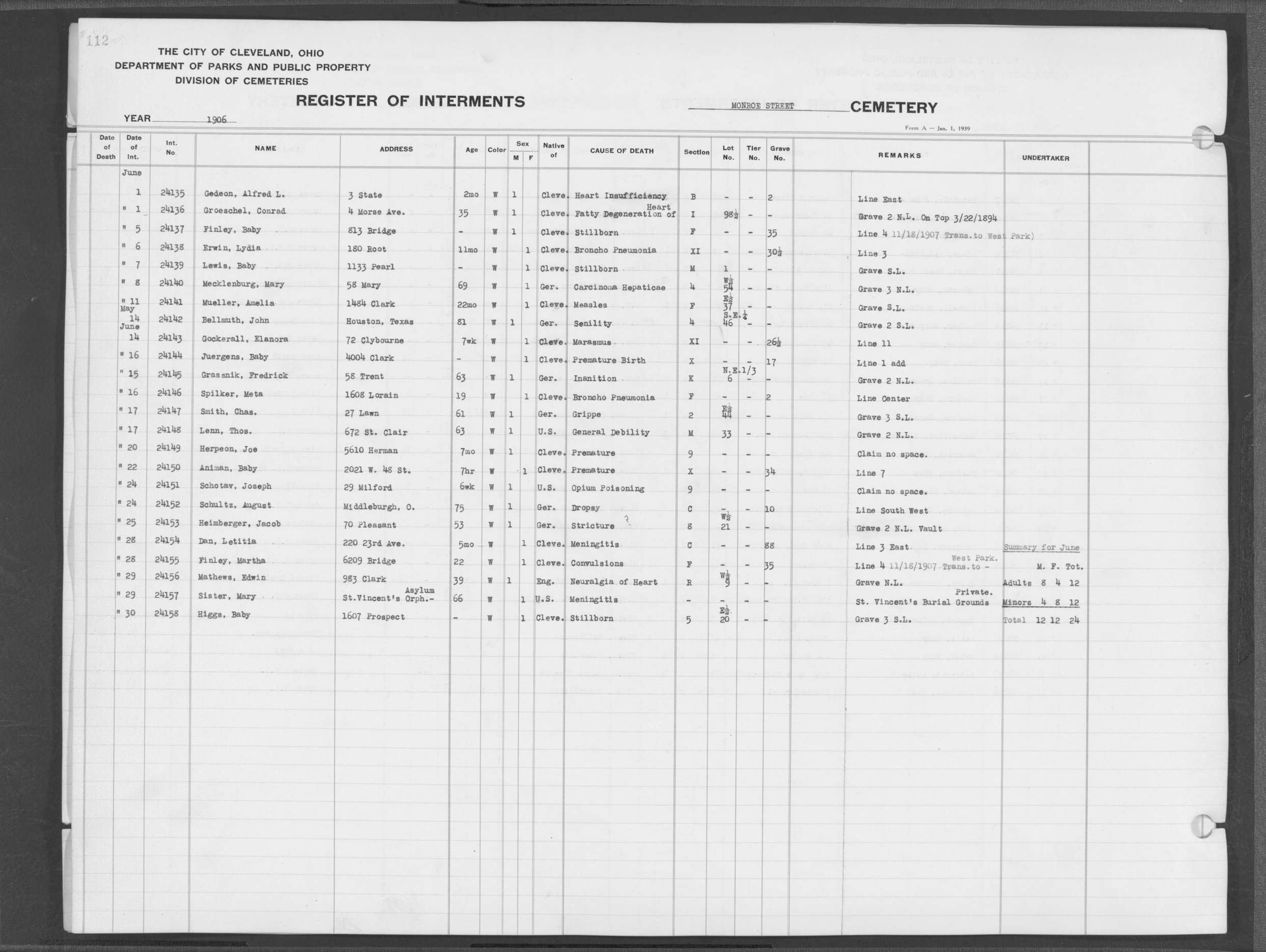 | Monroe Street | 3 | 125 | Jul | 1 | 1907 | 24467 | Swan, | Baby | W | M | ||||