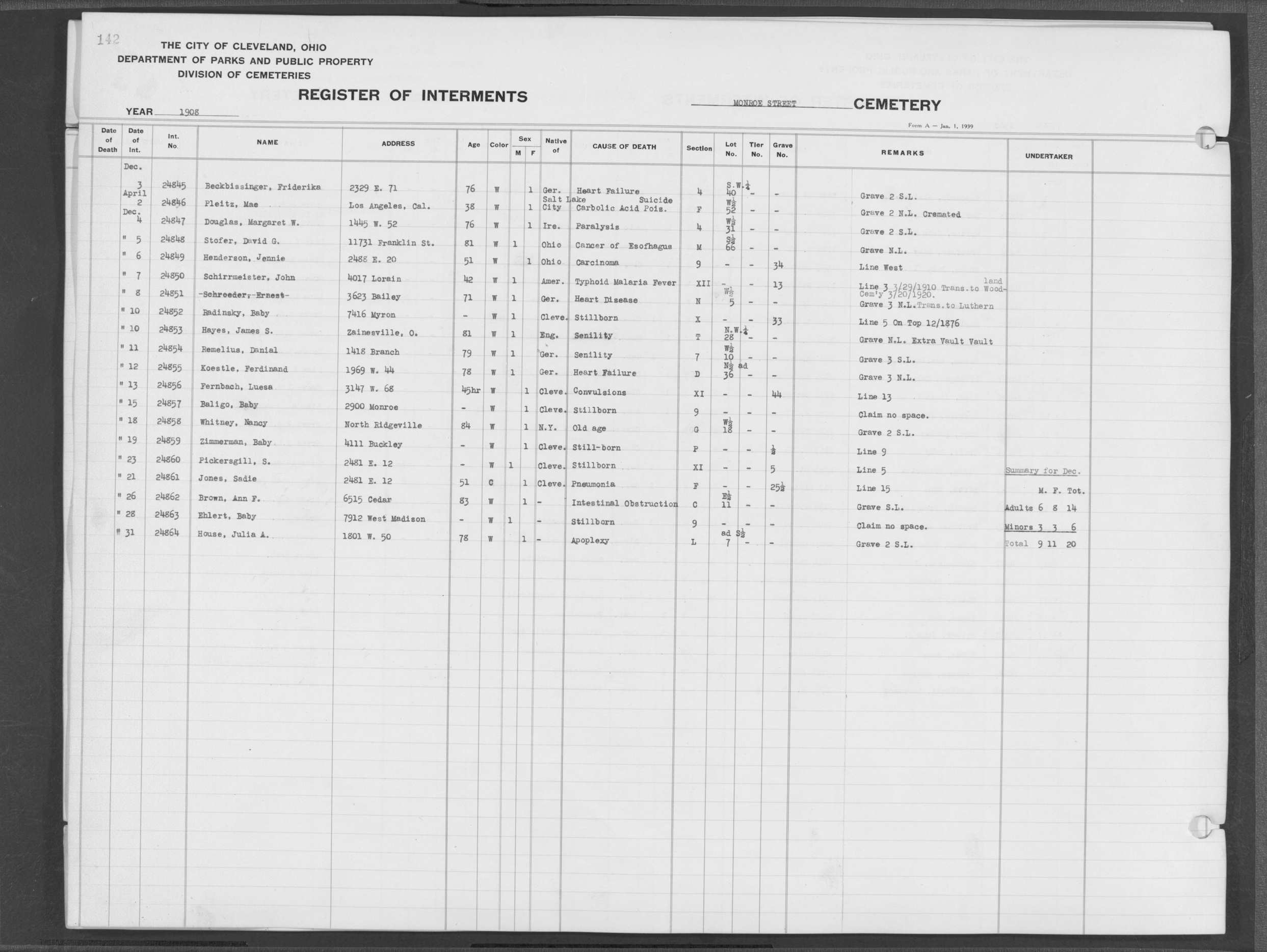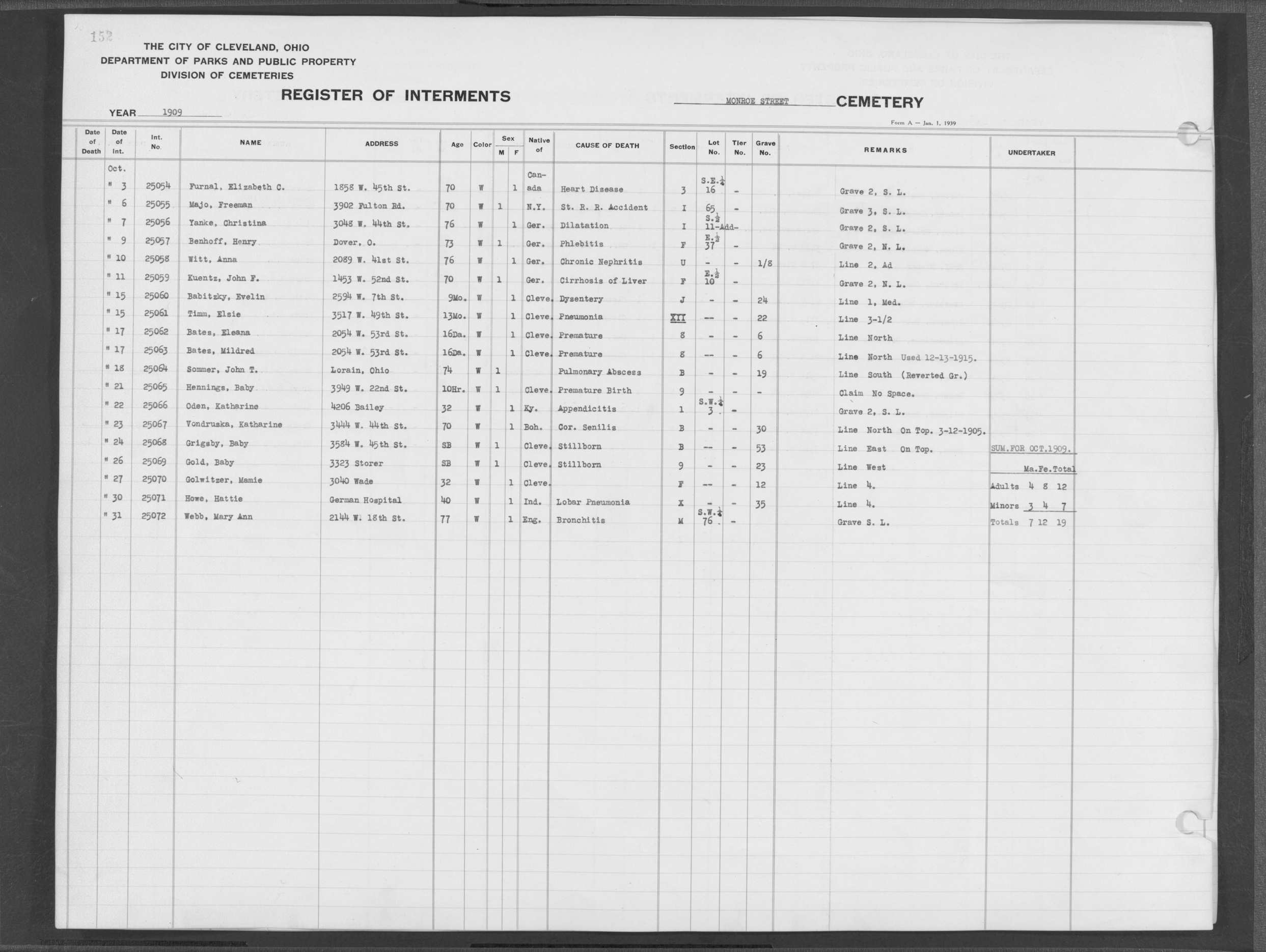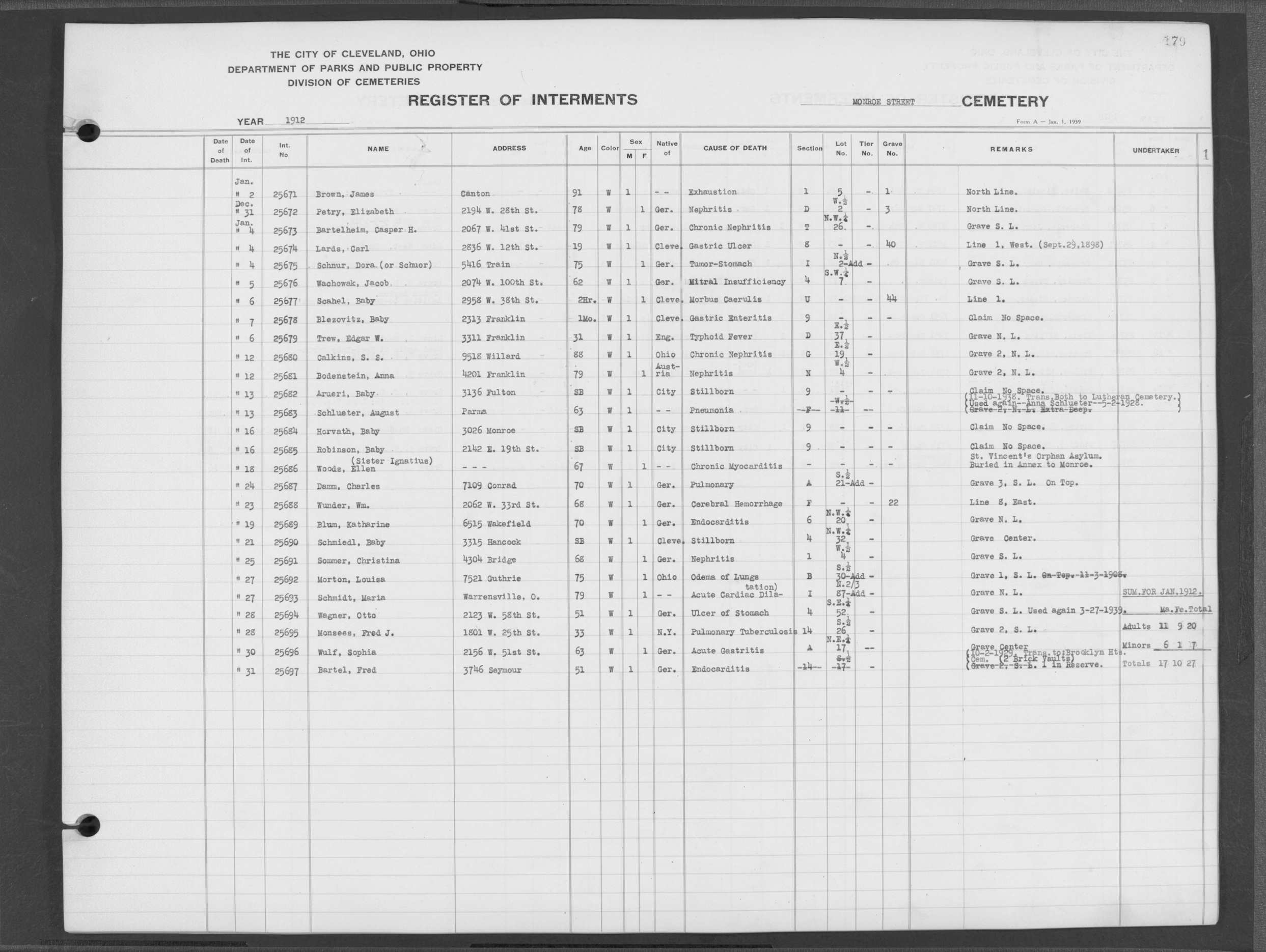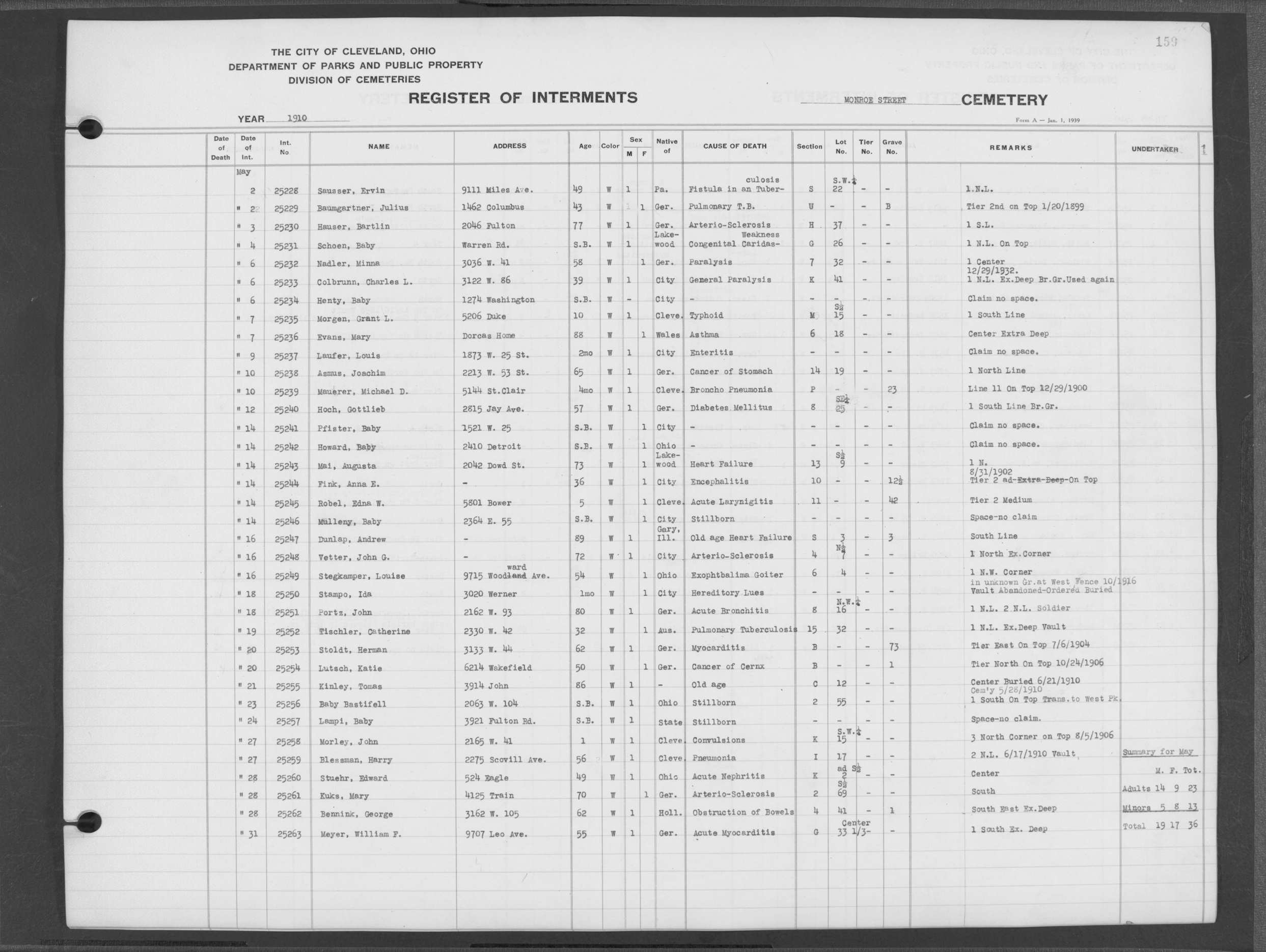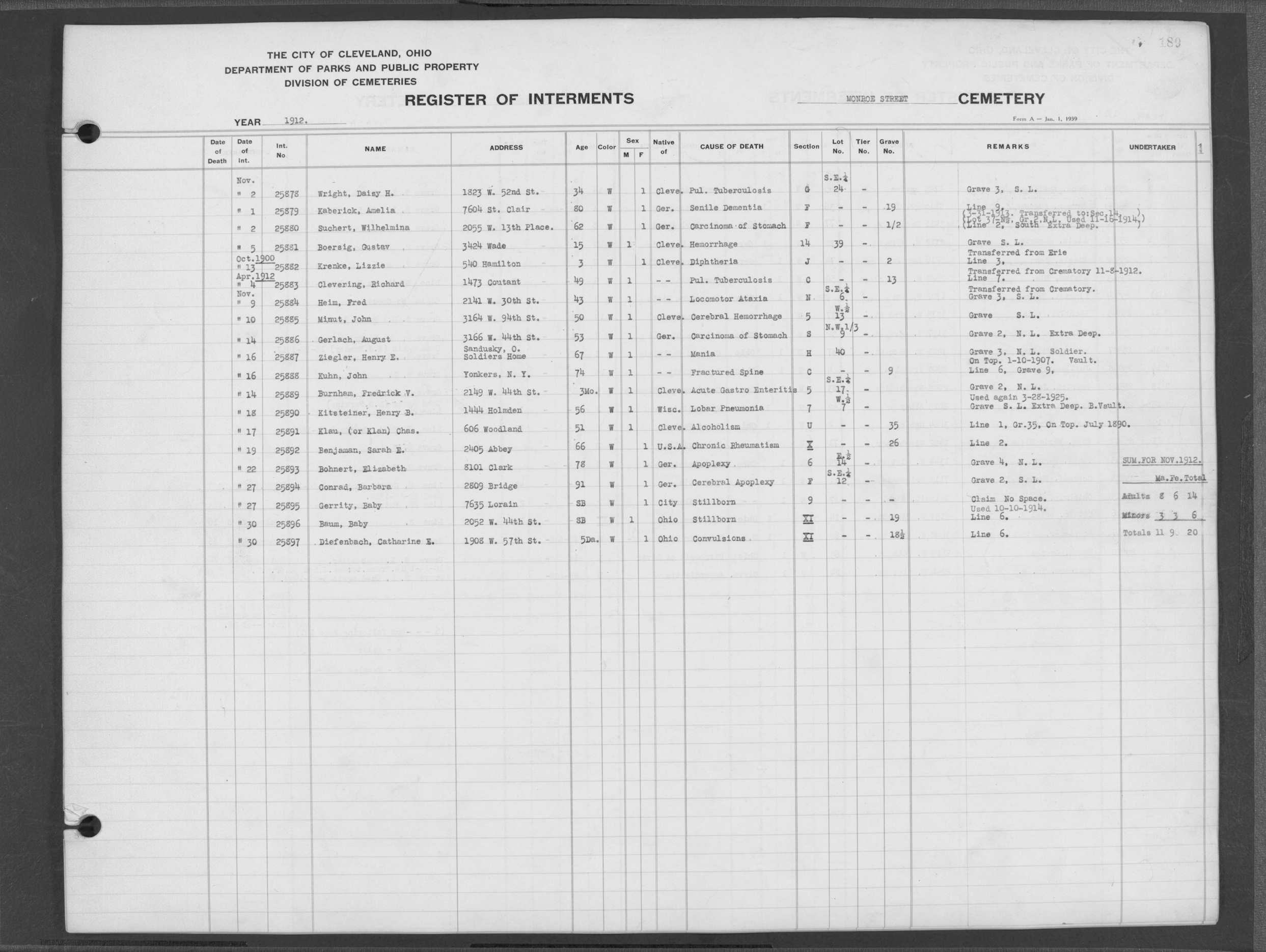 | Monroe Street | 3 | 154 | Dec | 2 | 1909 | 25097 | Szucs, | SB | W | M | ||||