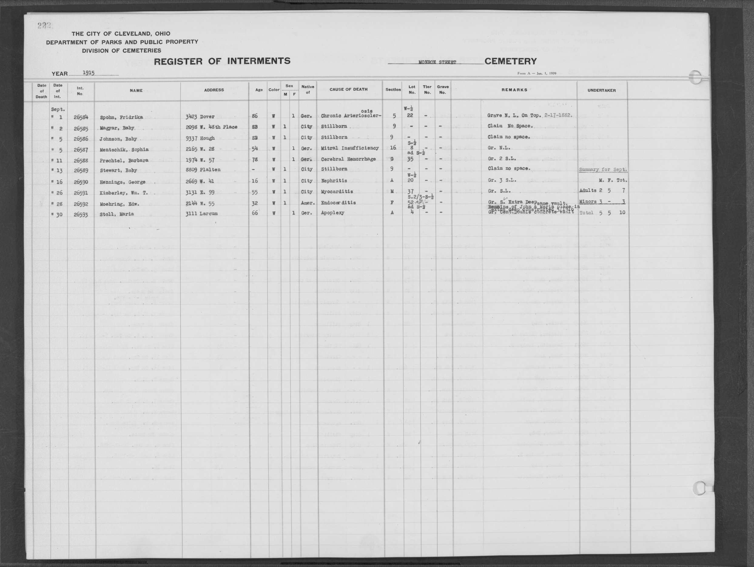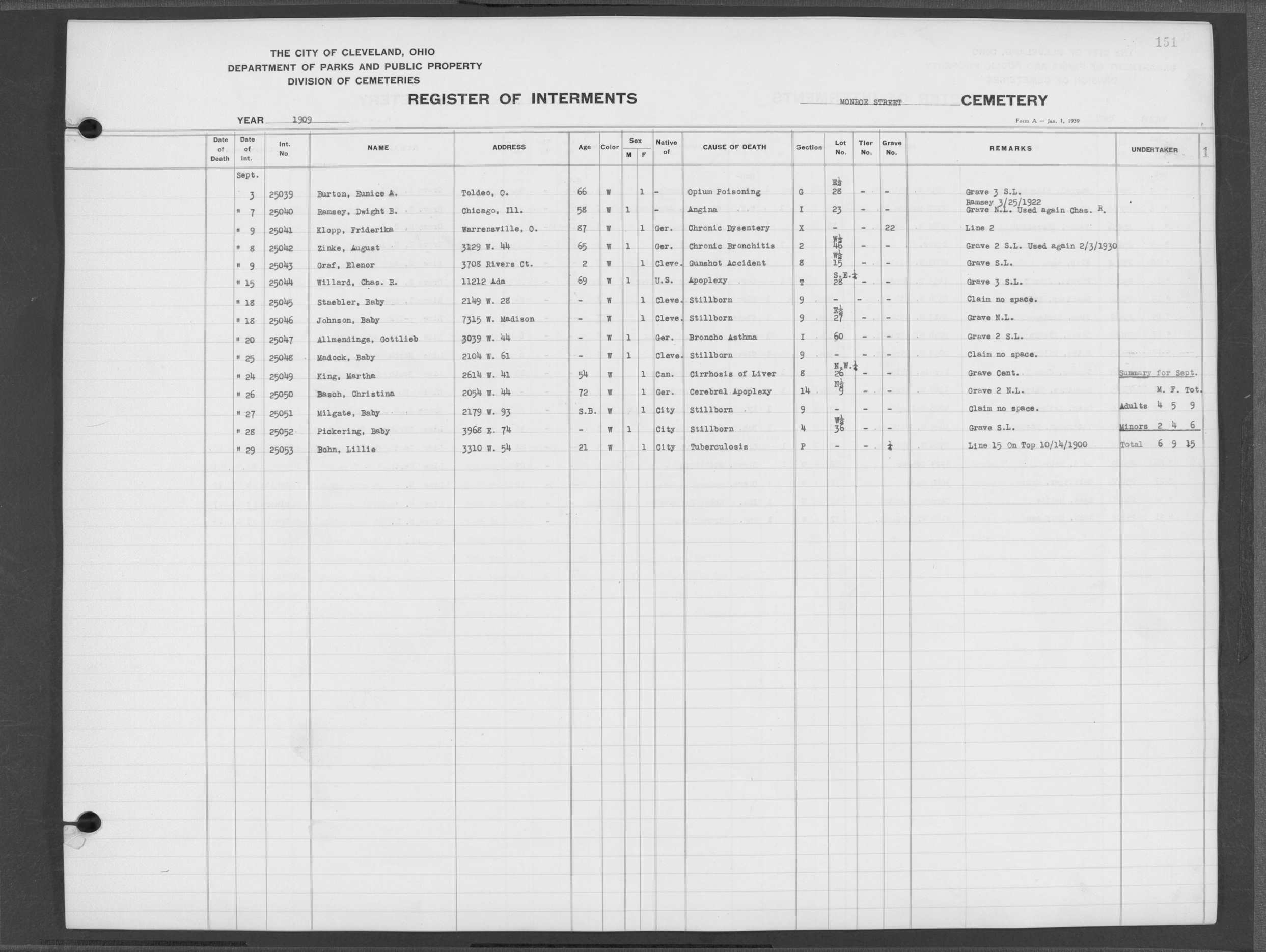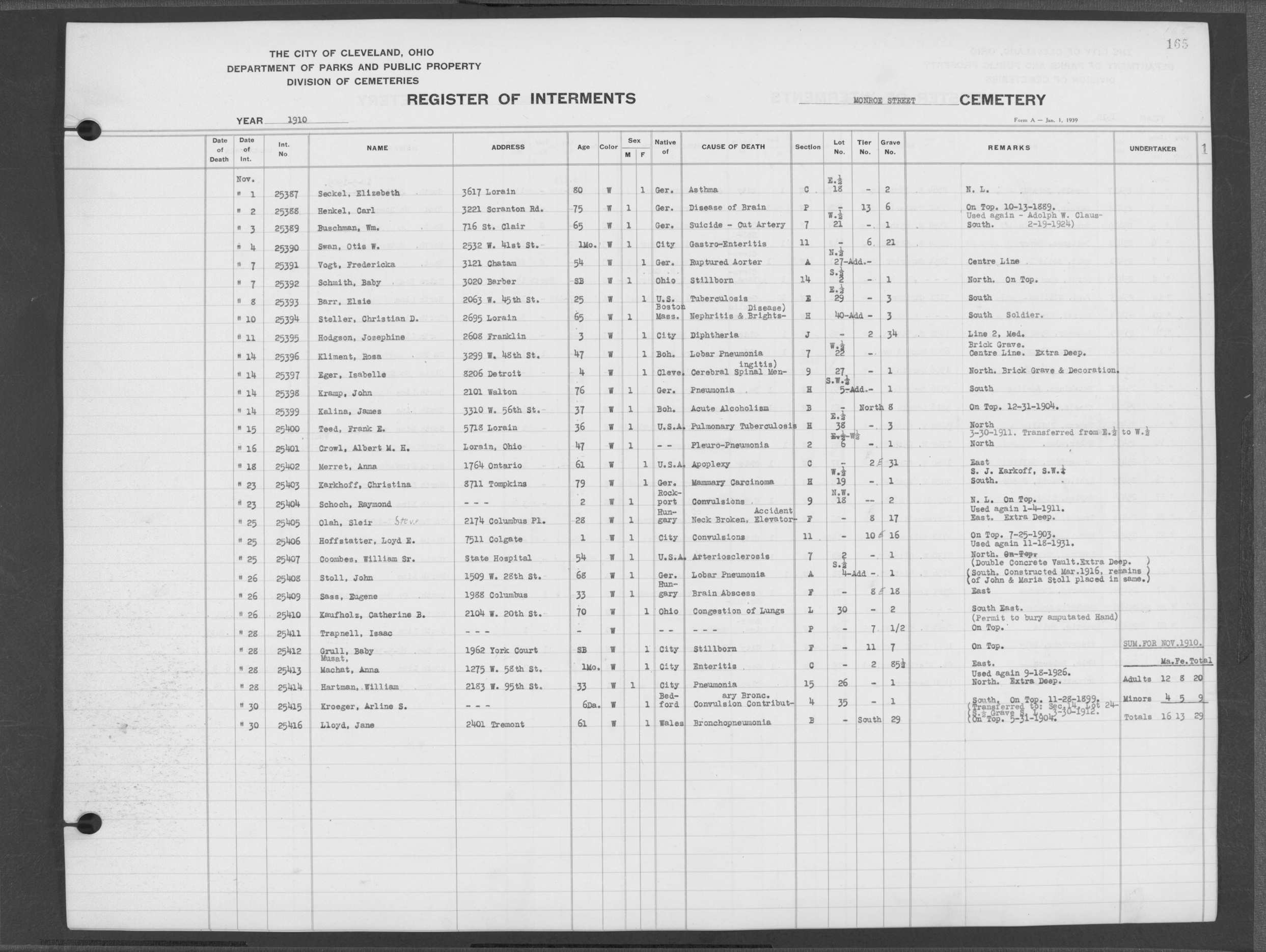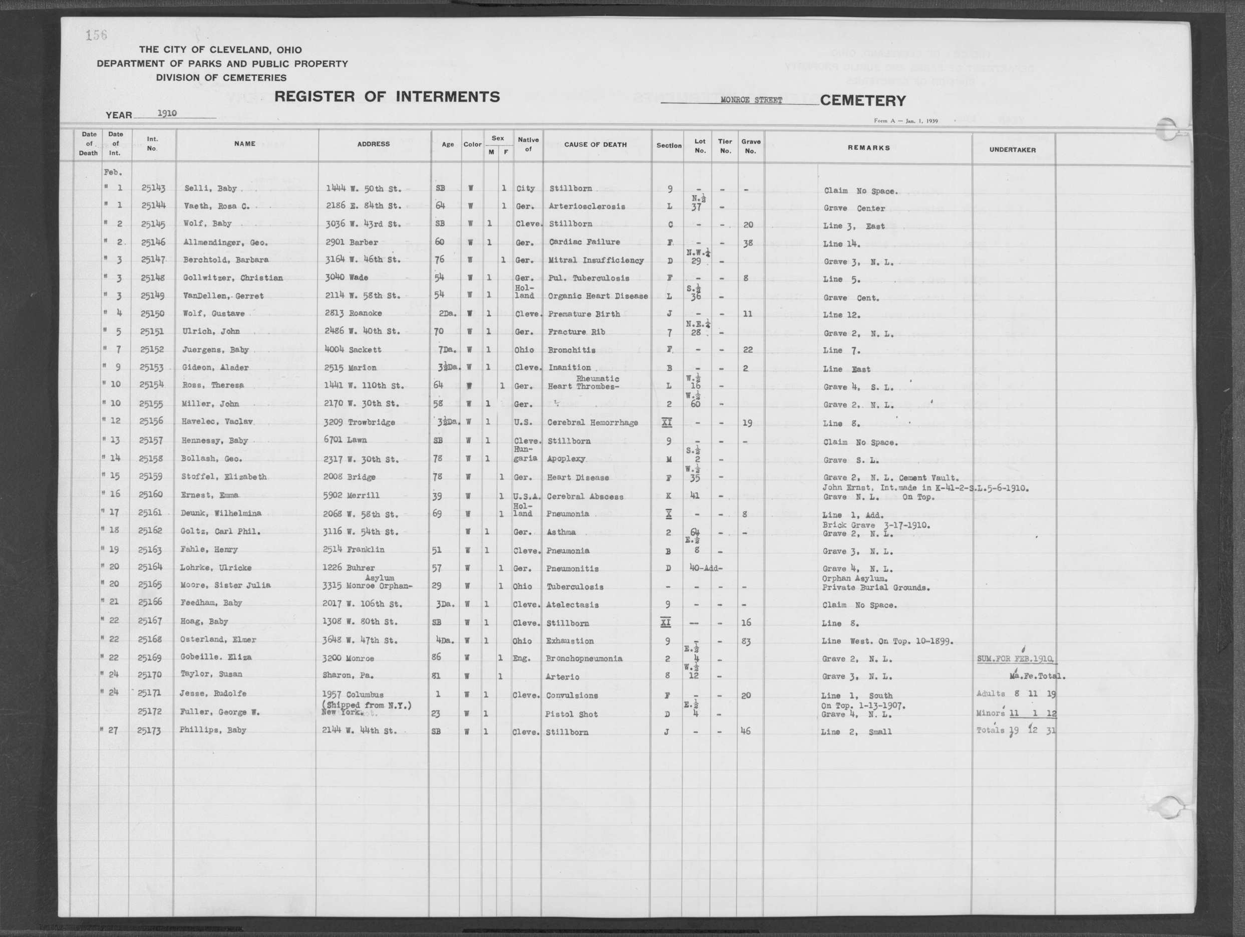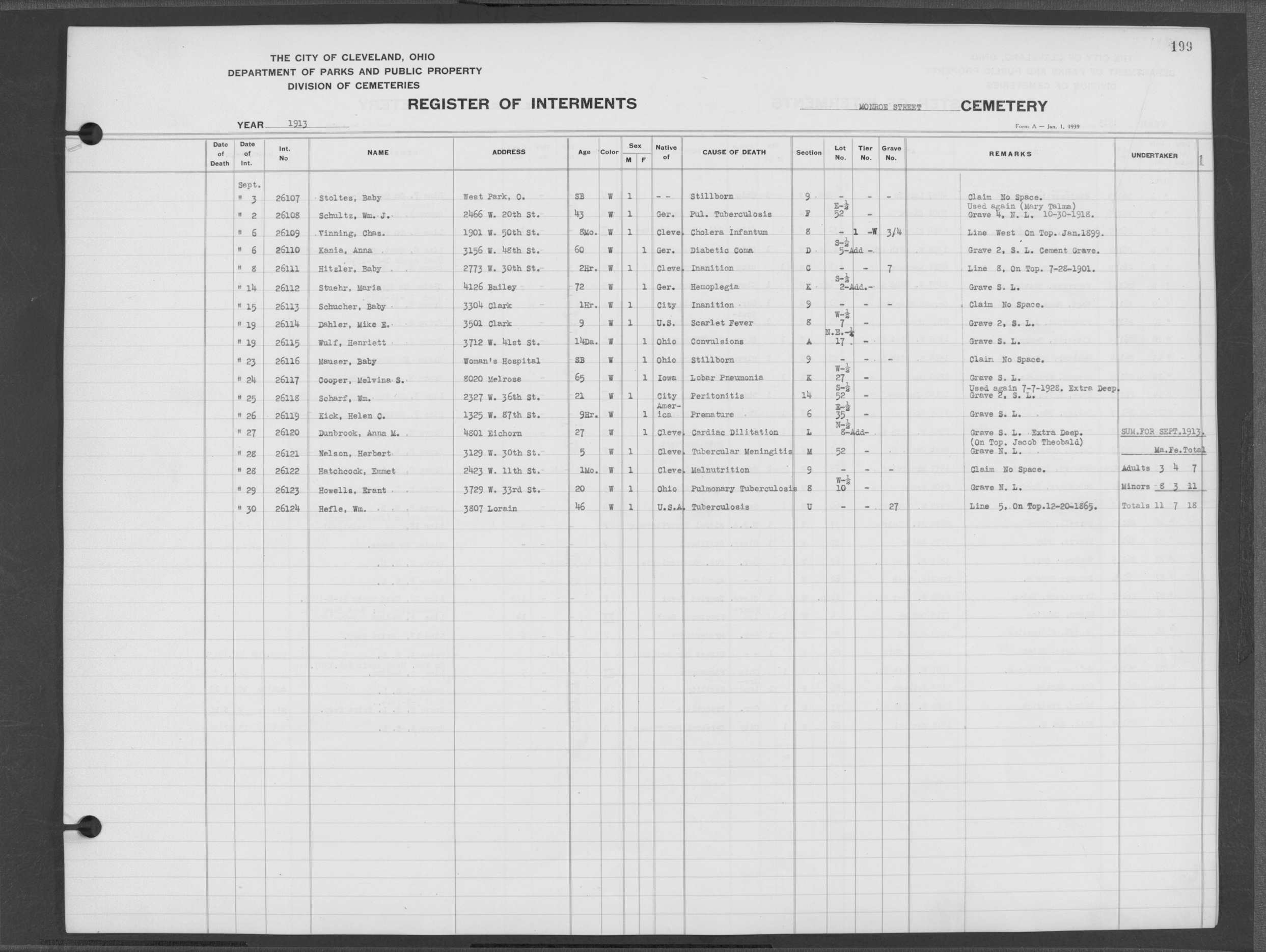 | Monroe Street | 3 | 154 | Dec | 2 | 1909 | 25097 | Szucs, | SB | W | M | ||||