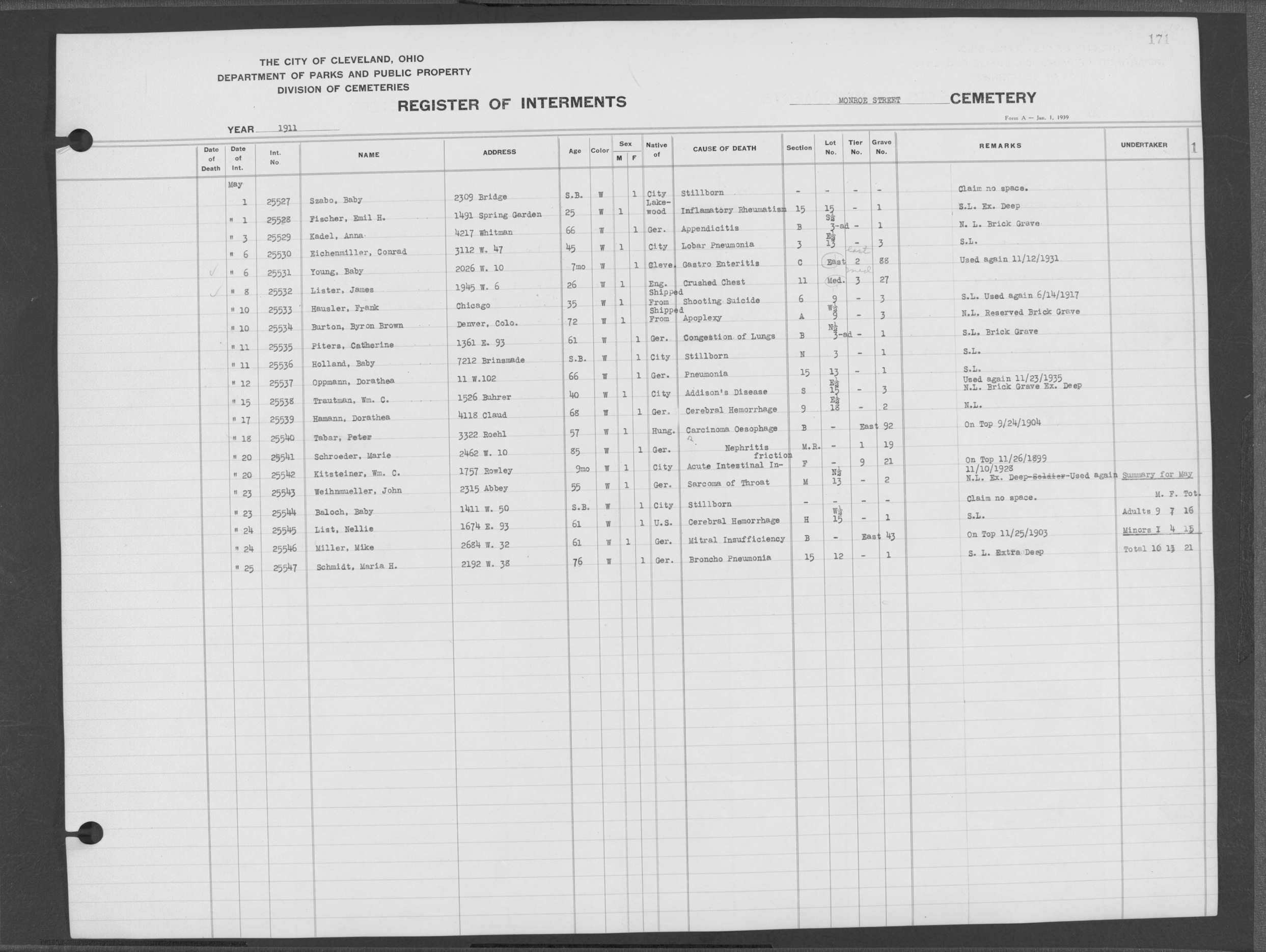 | Monroe Street | 3 | 171 | May | 1 | 1911 | 25527 | Szabo, | SB | W | F | ||||