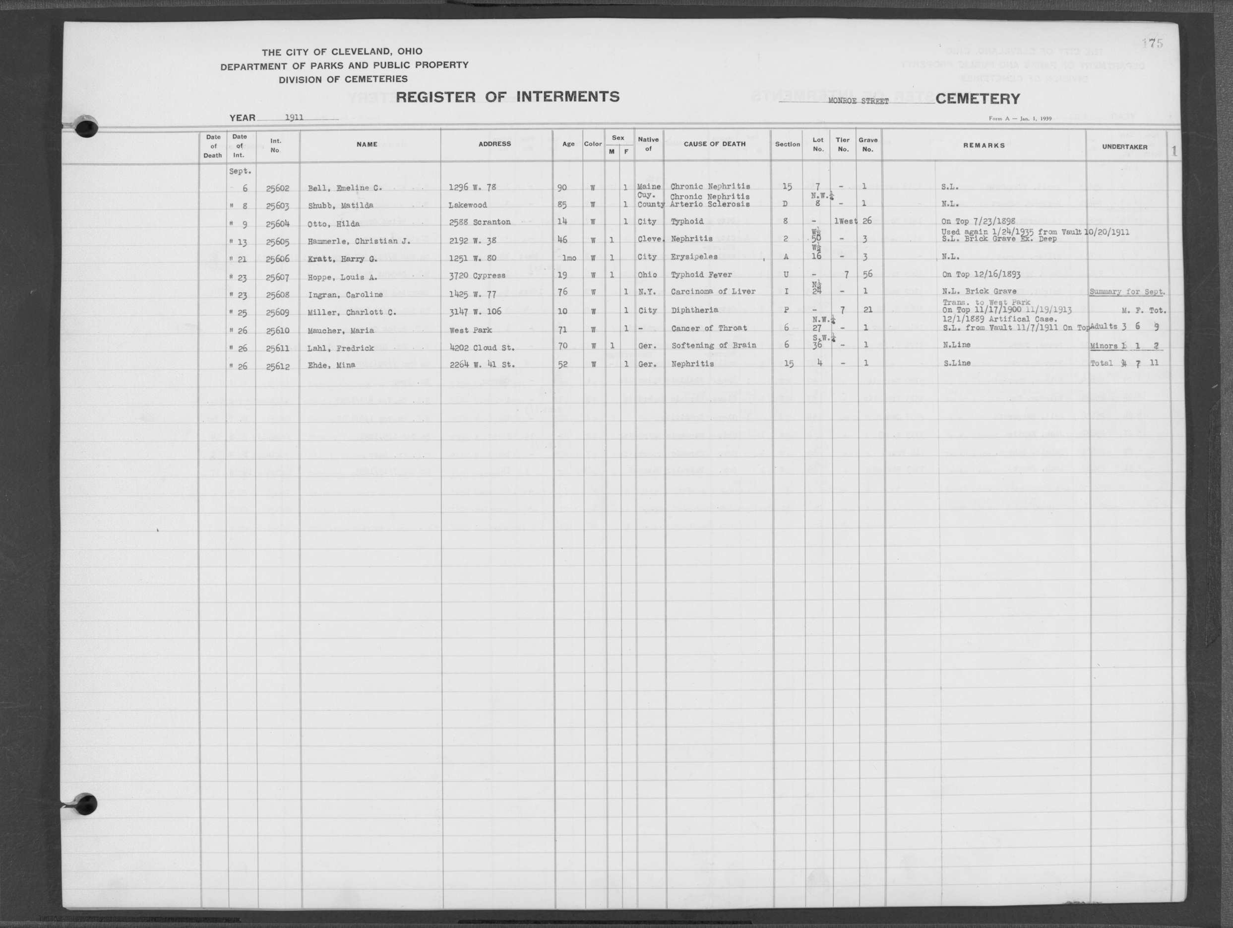 | Monroe Street | 3 | 296 | Oct | 6 | 1926 | 28579 | Shere, Caroline | 82y | W | F | ||||