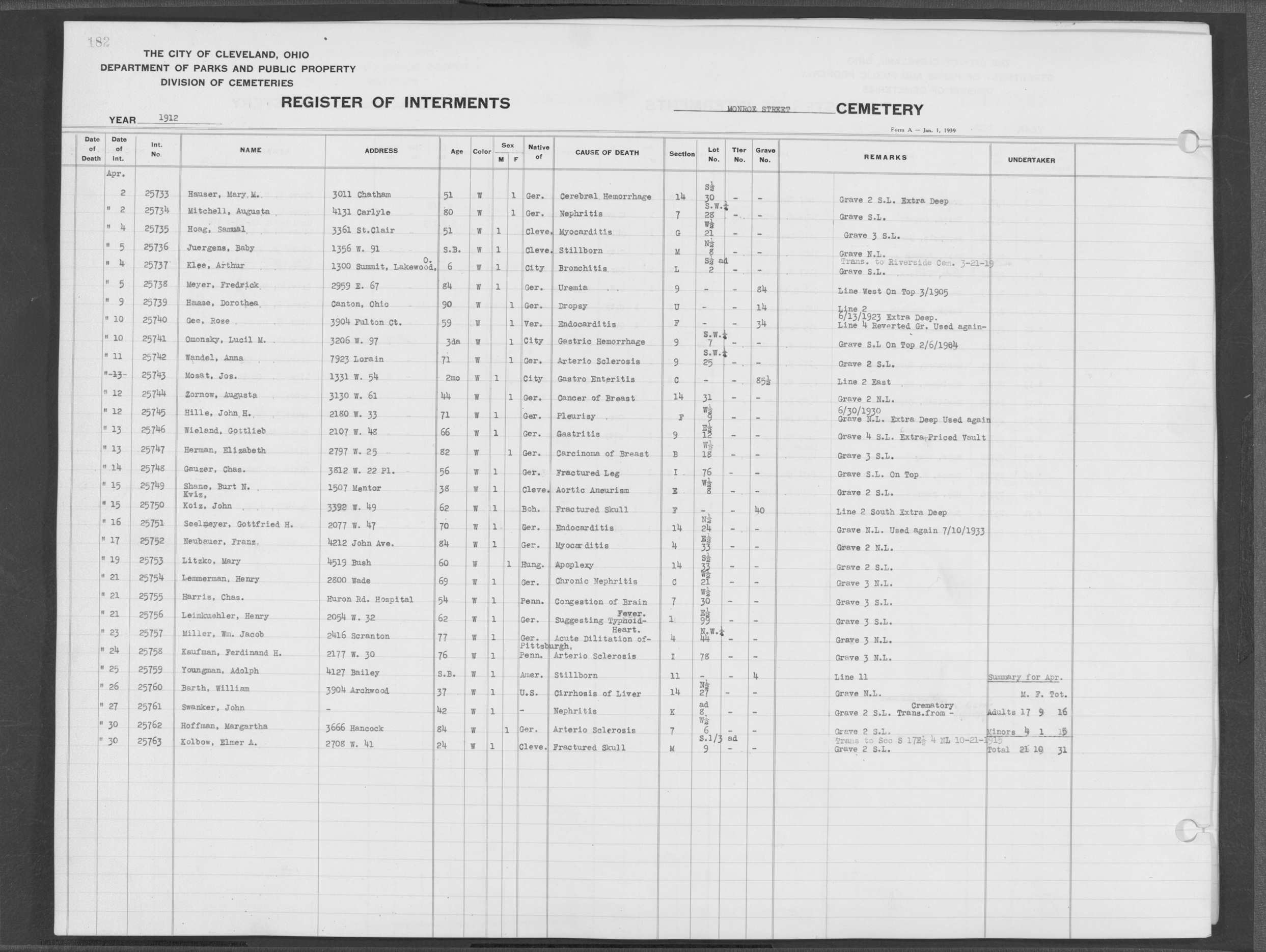 | Monroe Street | 3 | 182 | Apr | 15 | 1912 | 25749 | Shane, Burt N | 38y | W | M | ||||