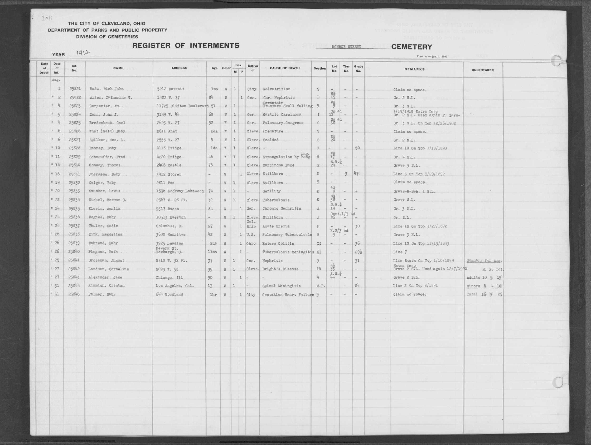 | Monroe Street | 3 | 186 | Aug | 20 | 1912 | 25833 | Swanker, Lewis | 74y | W | M | ||||