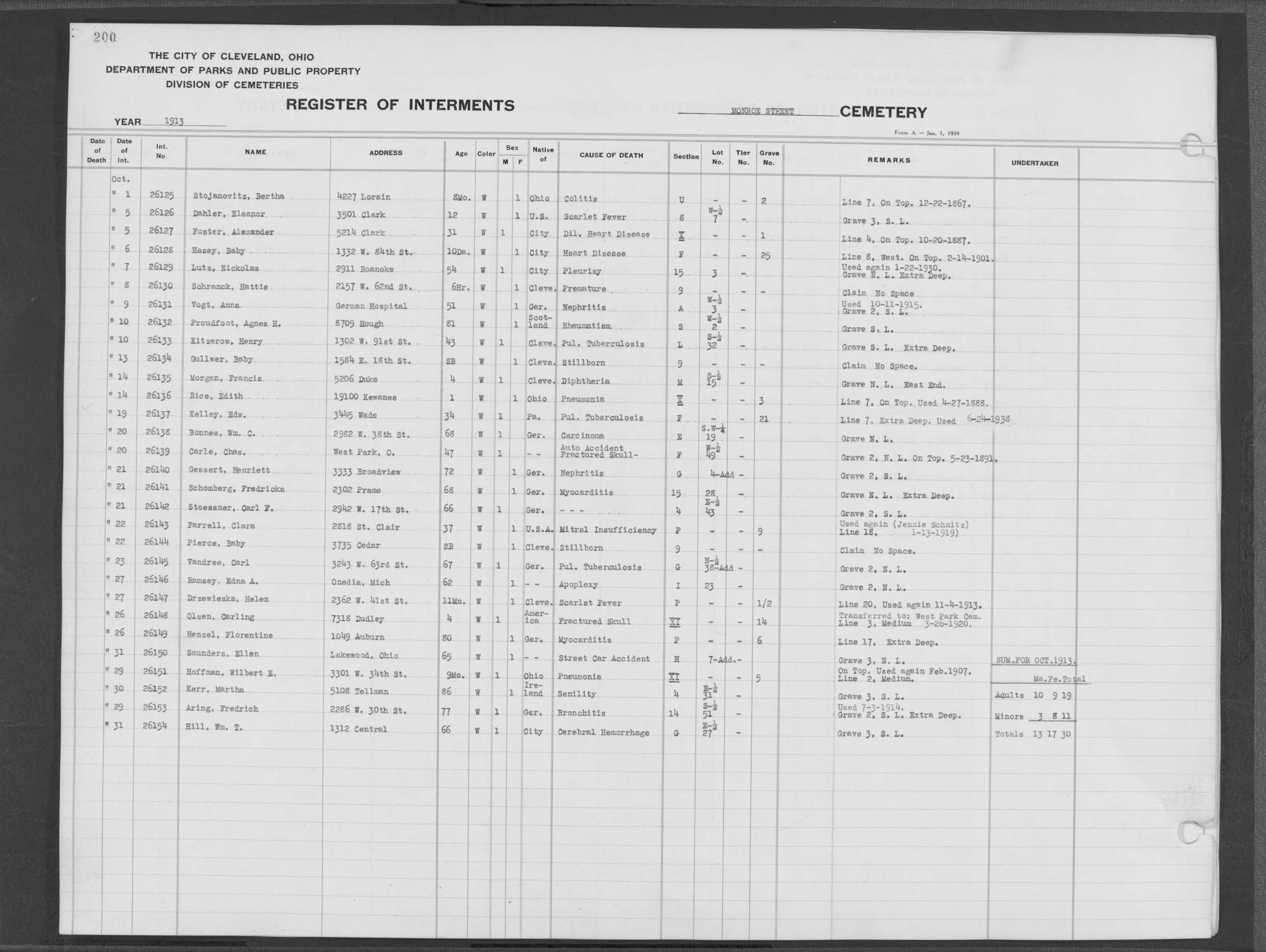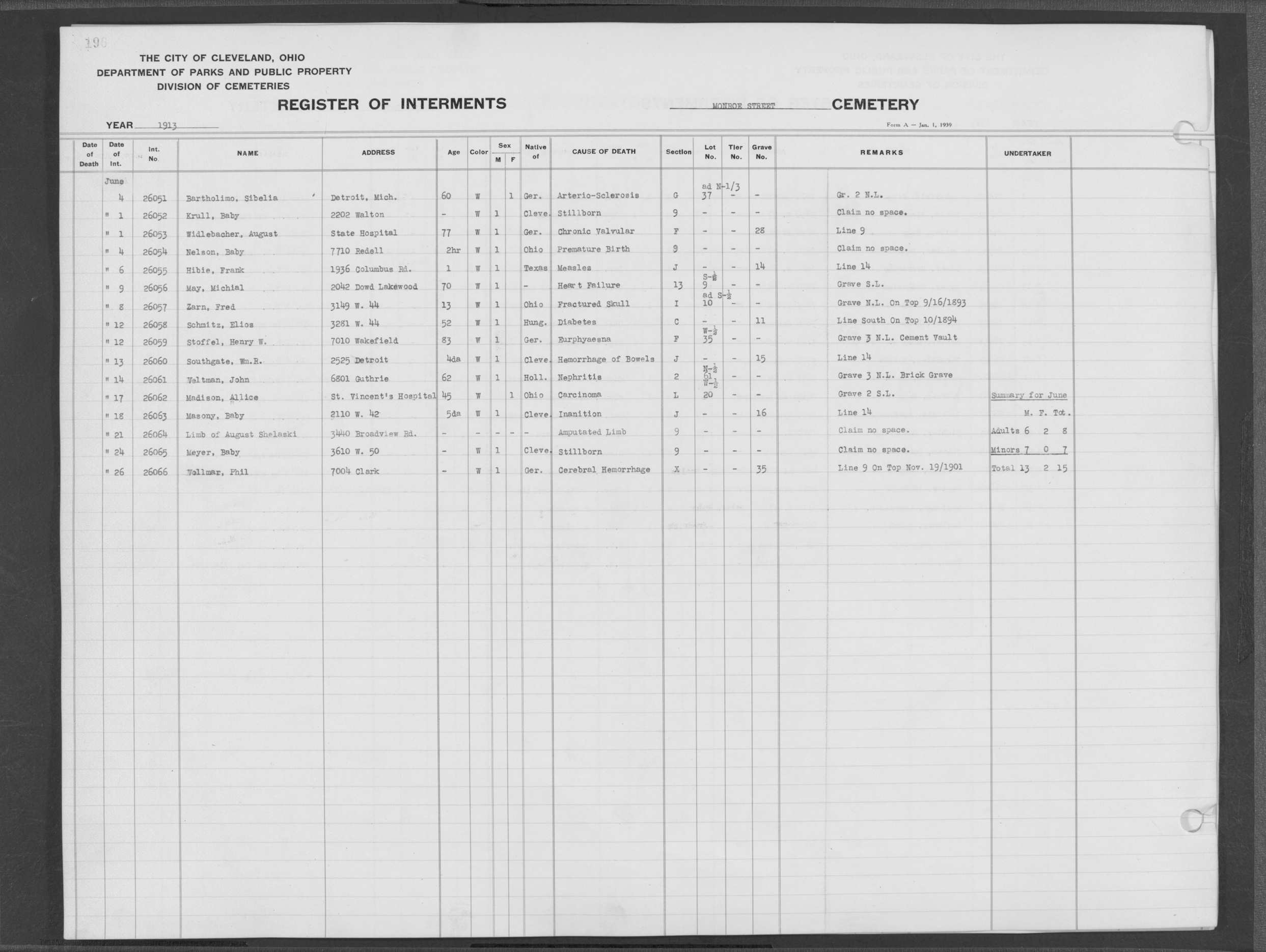 | Monroe Street | 3 | 196 | Jun | 21 | 1913 | 26064 | Shelaski, August | Limb of | ||||||