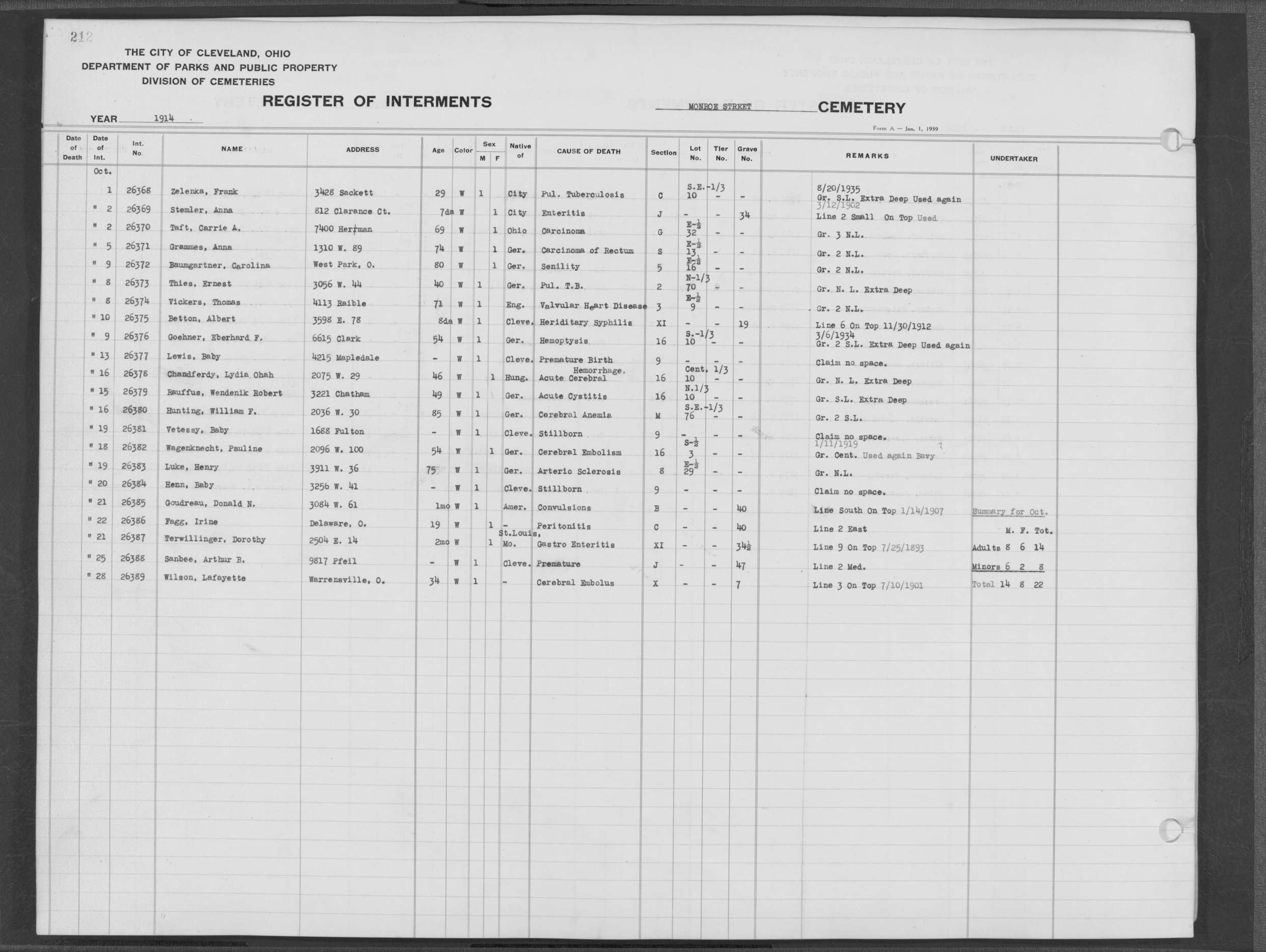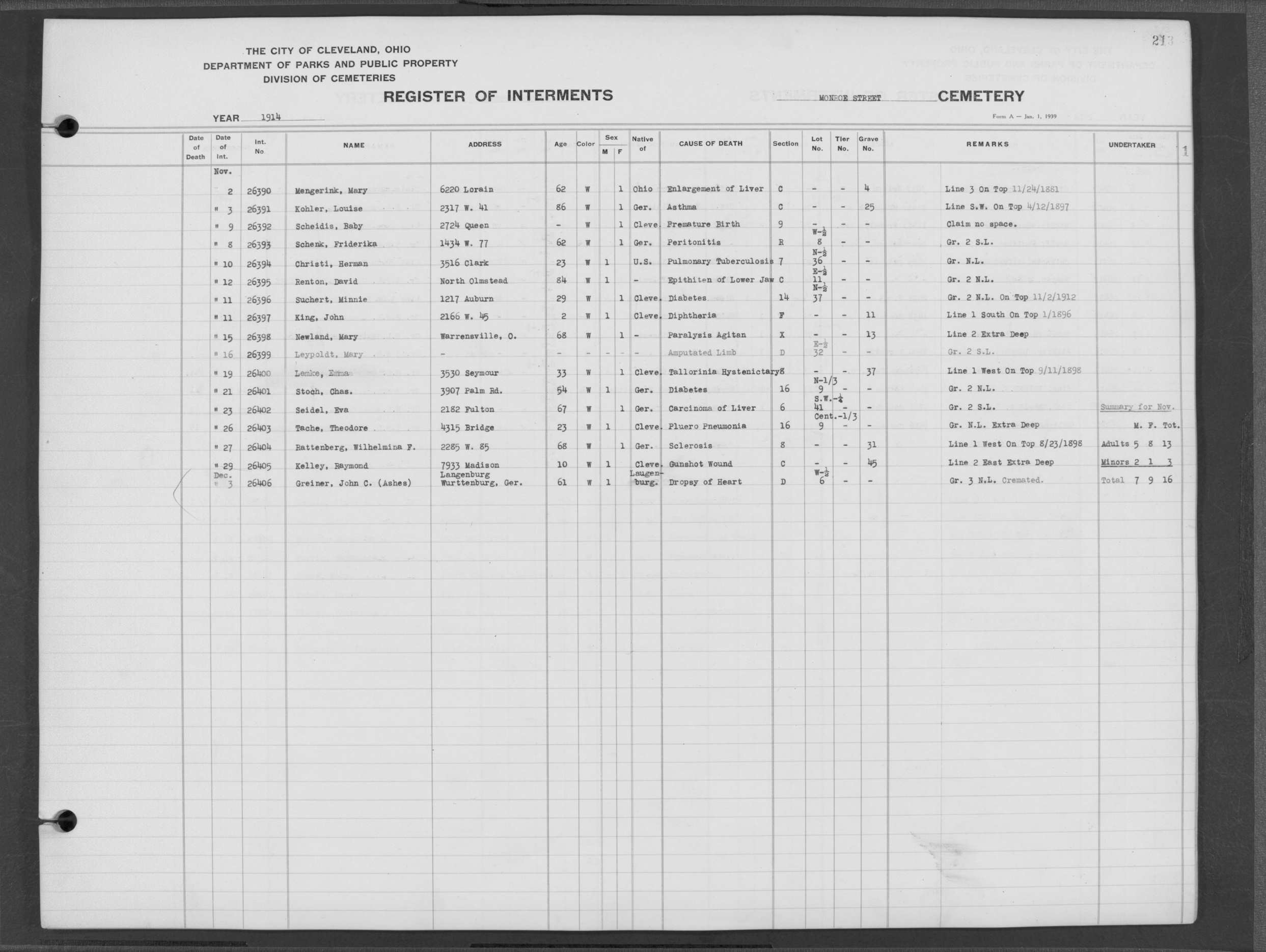 | Monroe Street | 3 | 214 | Dec | 11 | 1914 | 26412 | Swayer, John | 66y | W | M | ||||