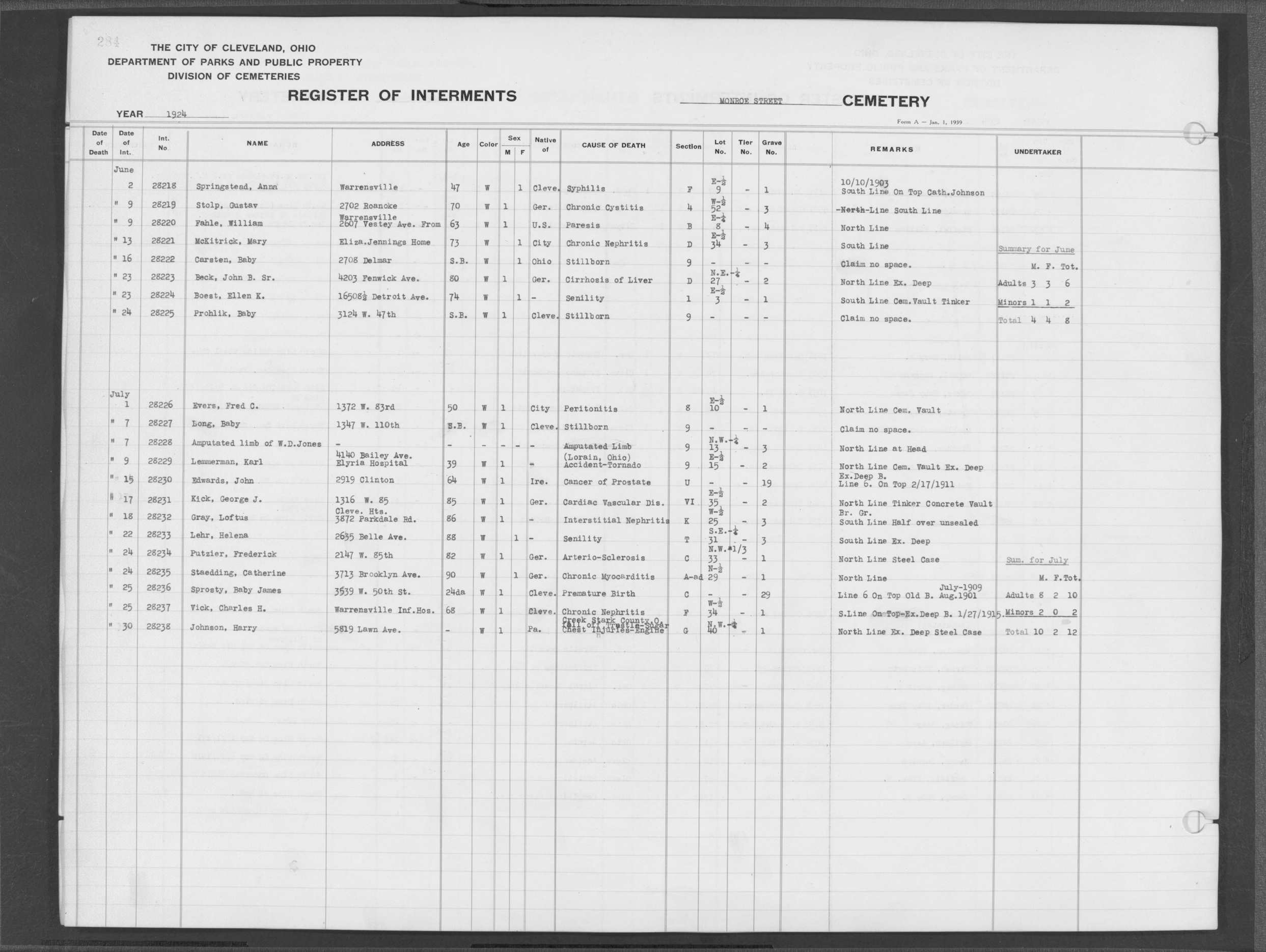 | Monroe Street | 3 | 281 | Jan | 4 | 1924 | 28143 | Szanyi, | SB | W | M | ||||