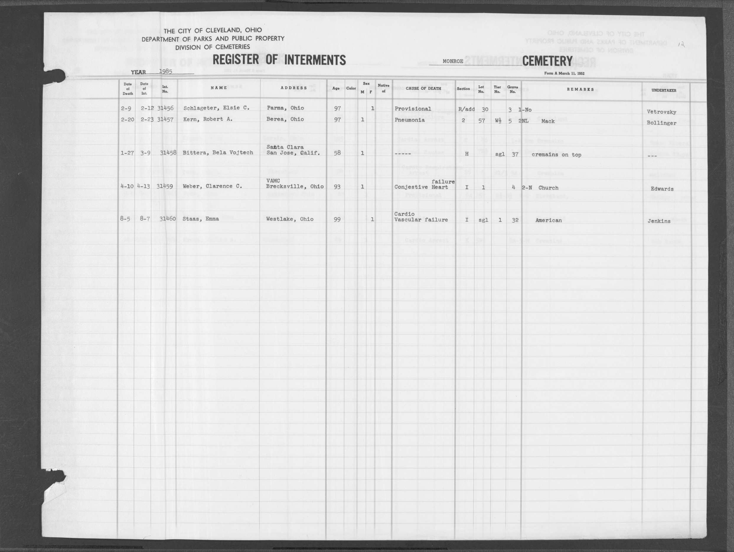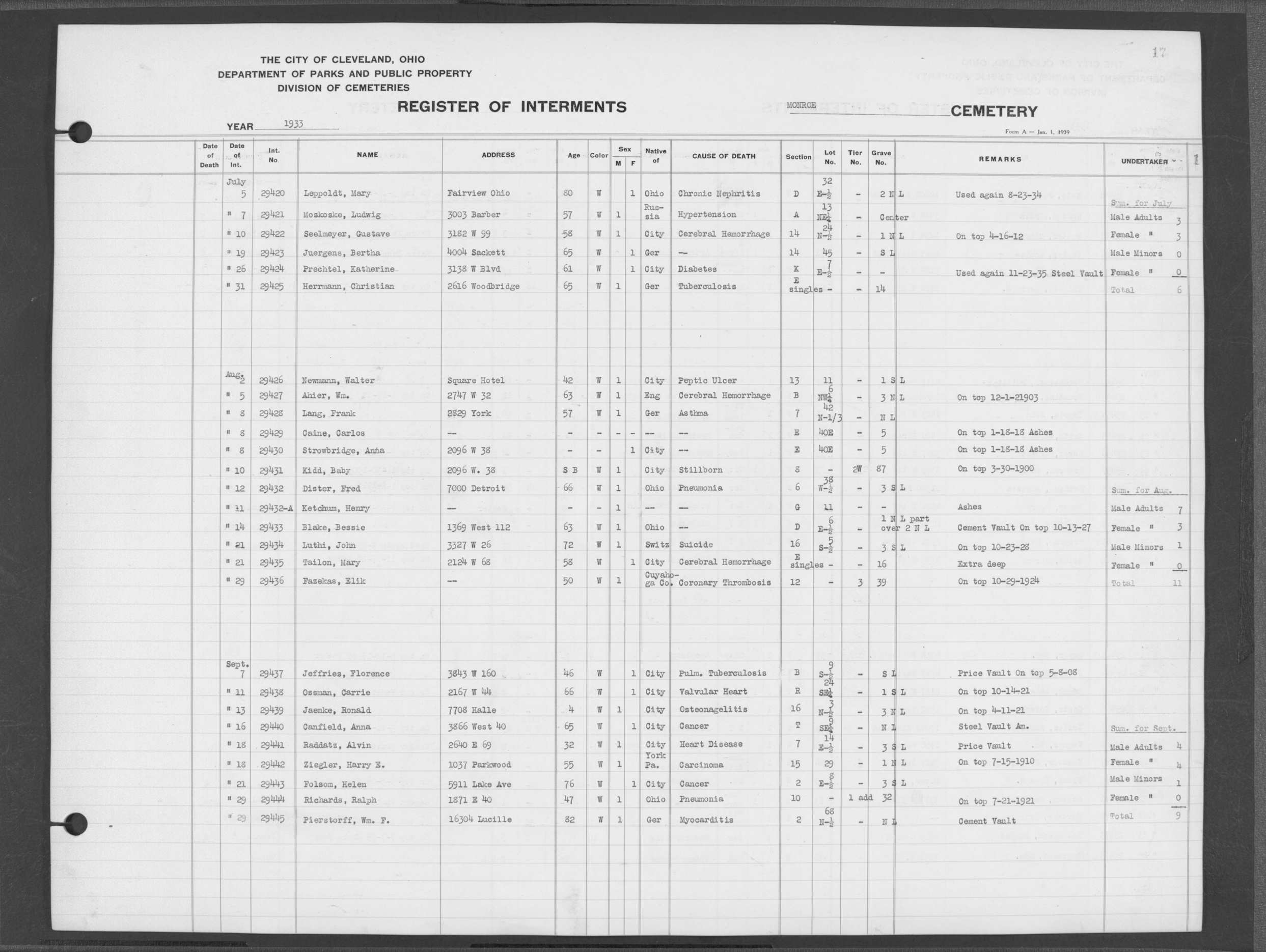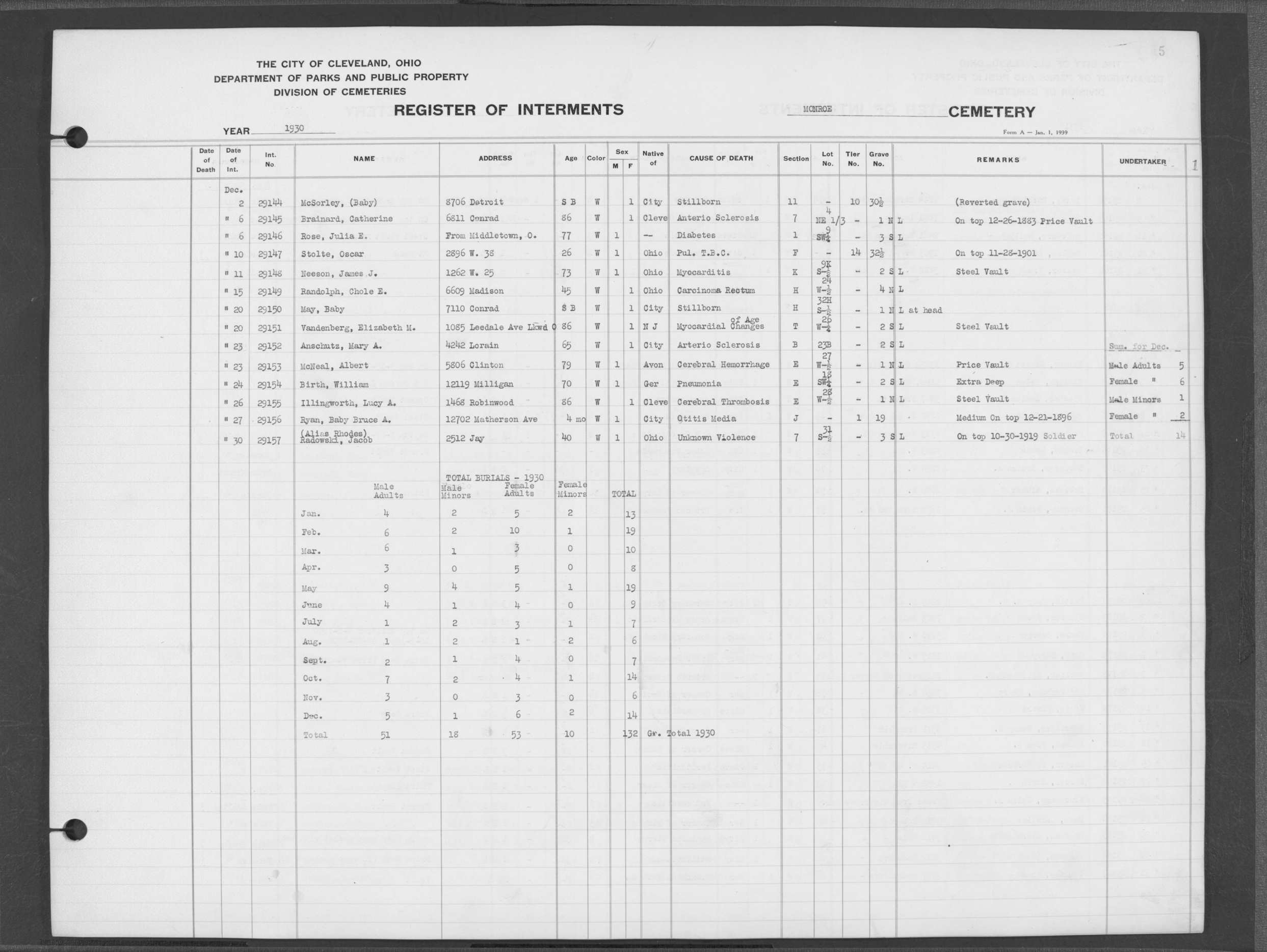 | Monroe Street | 4 | 13 | Dec | 30 | 1932 | 29363 | Swanker, Chas W | 65y | W | M | ||||