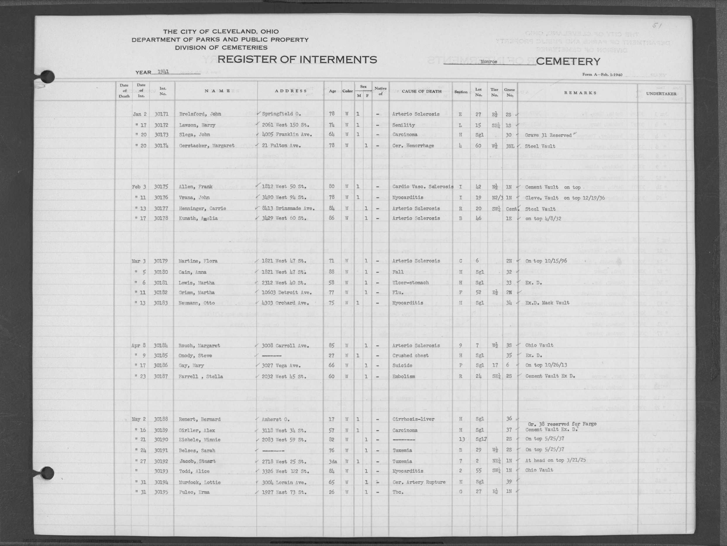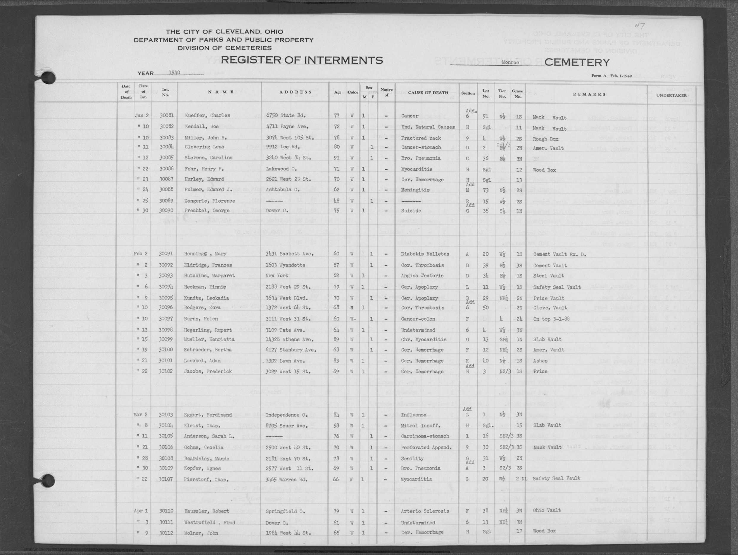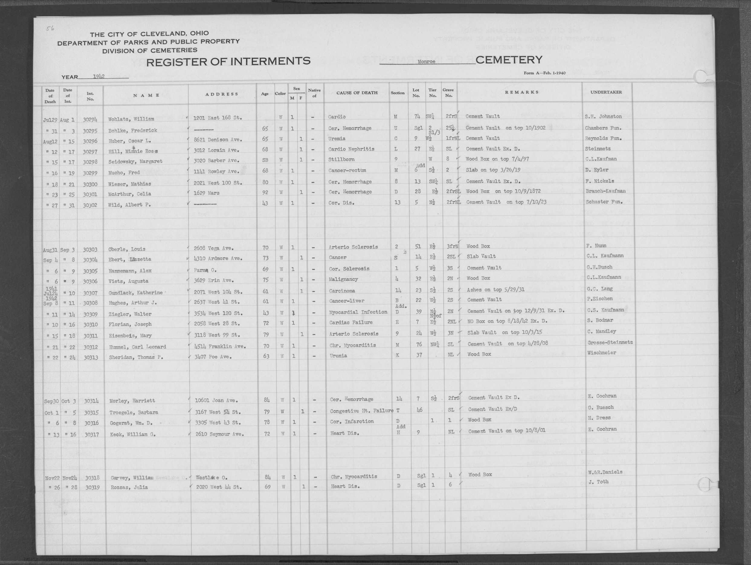 | Monroe Street | 4 | 52 | Oct | 30 | 1941 | 30223 | Szekerees, Frank | 55y | W | M | ||||