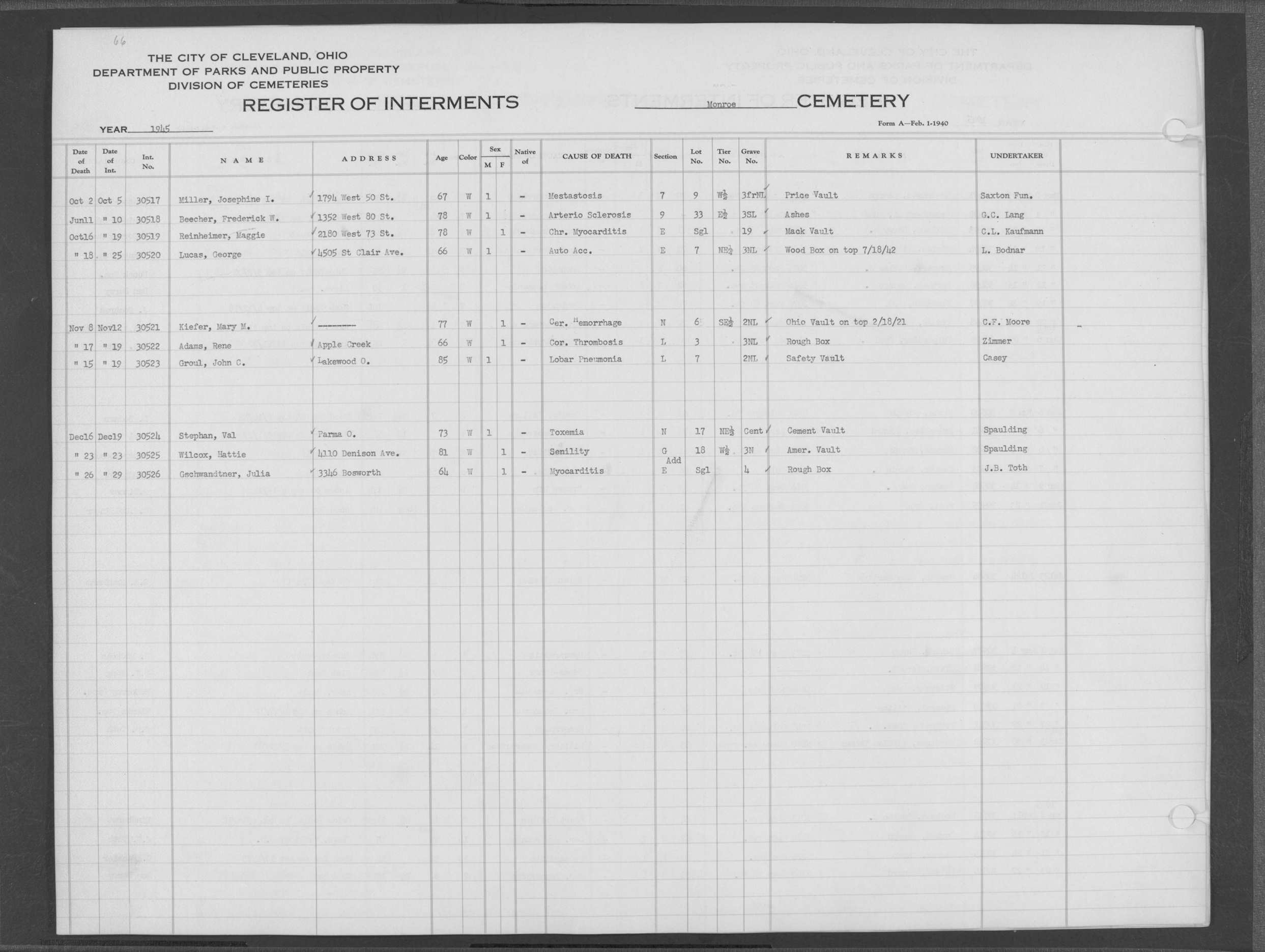 | Monroe Street | 4 | 62 | May | 8 | 1944 | May | 12 | 1944 | 30437 | Szucs, George | 71y | W | M | |