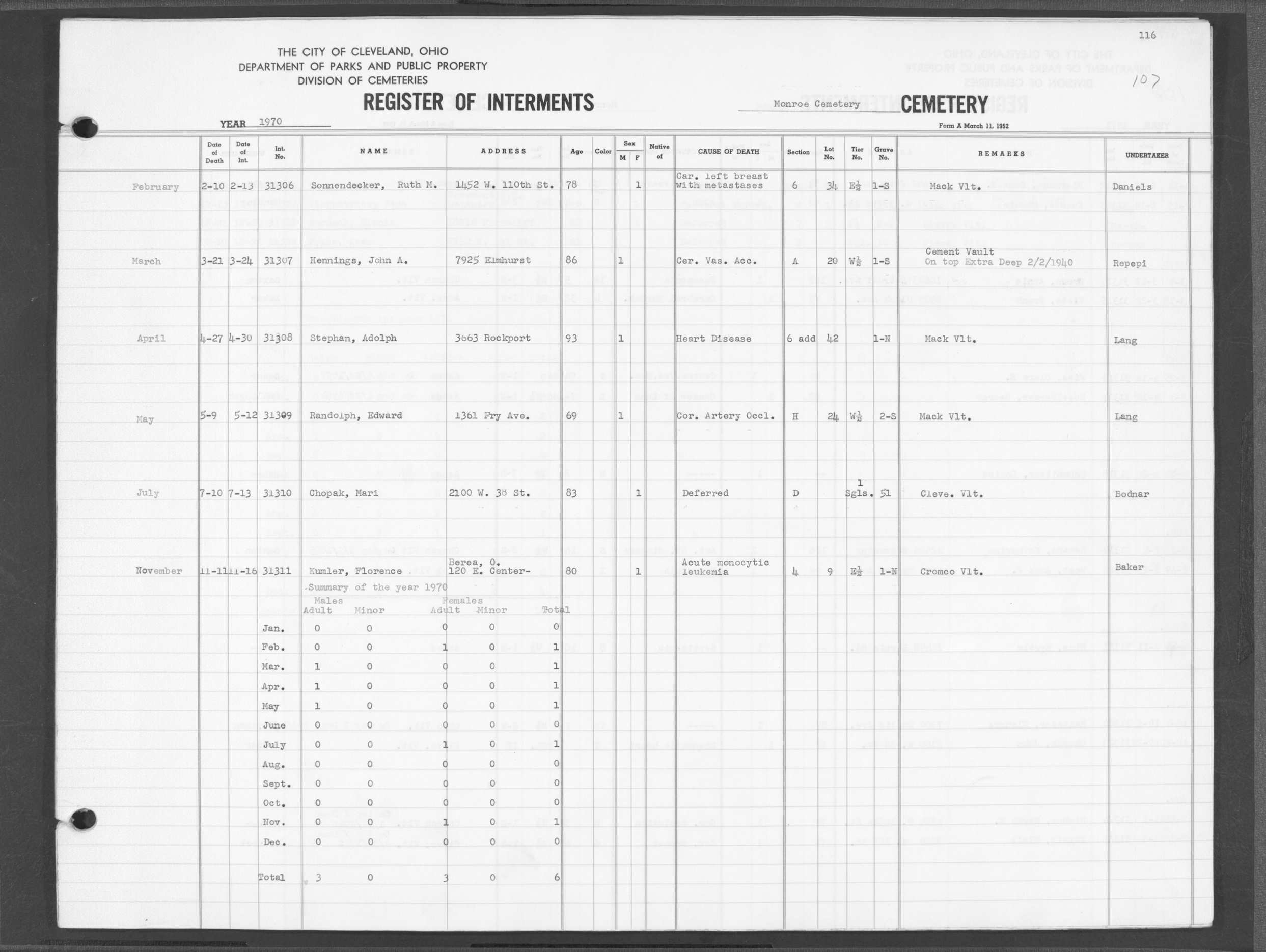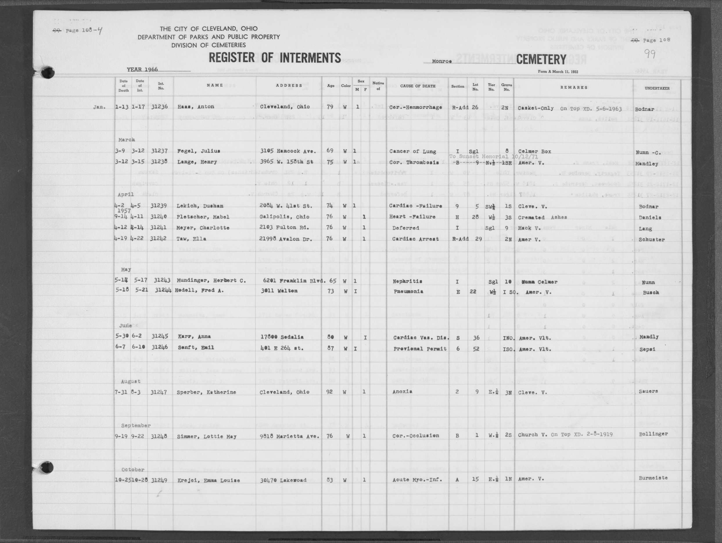 | Monroe Street | 4 | 81 | Mar | 28 | 1953 | 30865 | Swayer, Arthur | 52y | W | M | ||||