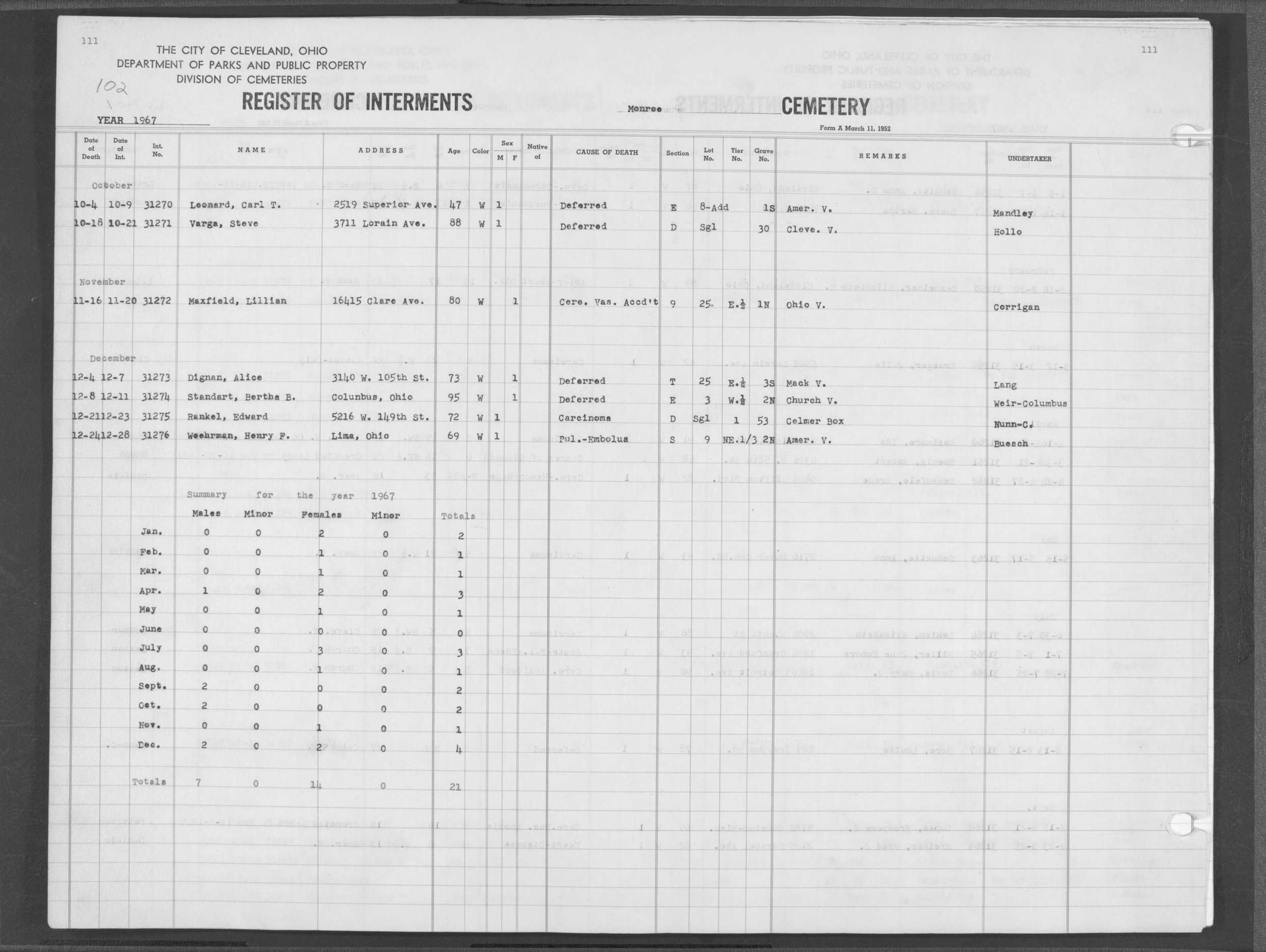 | Monroe Street | 4 | 6 | Mar | 4 | 1931 | 29174 | Shere, George | 62y | W | M | ||||