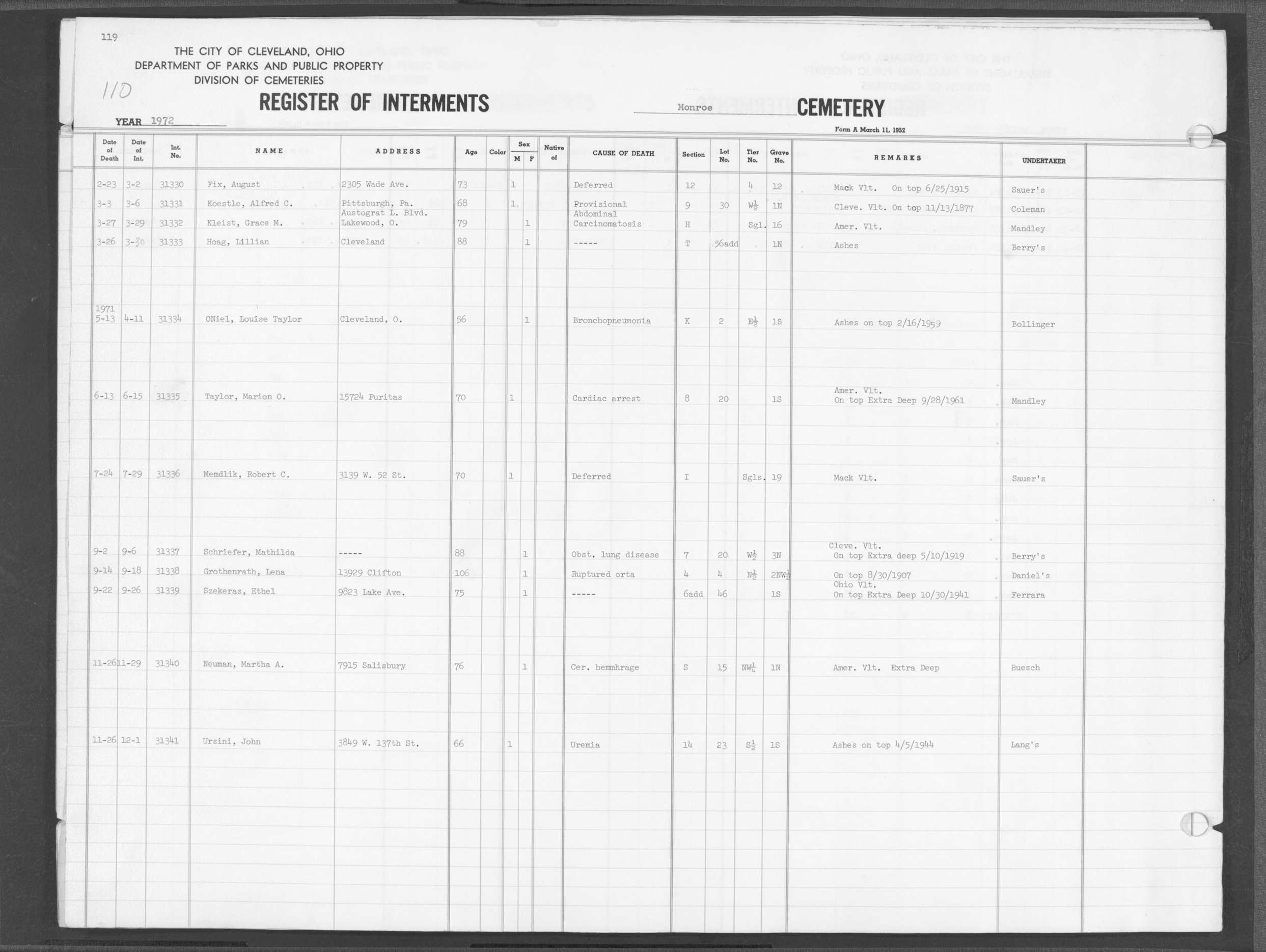 | Monroe Street | 4 | 110 | Sep | 22 | 1972 | Sep | 26 | 1972 | 31339 | Szekeras, Ethel | 75y | F | ||