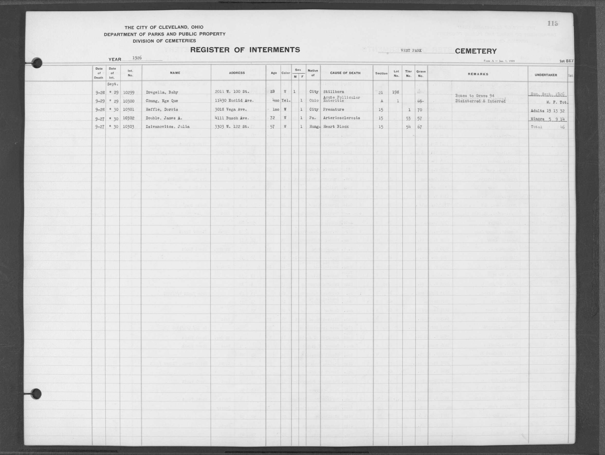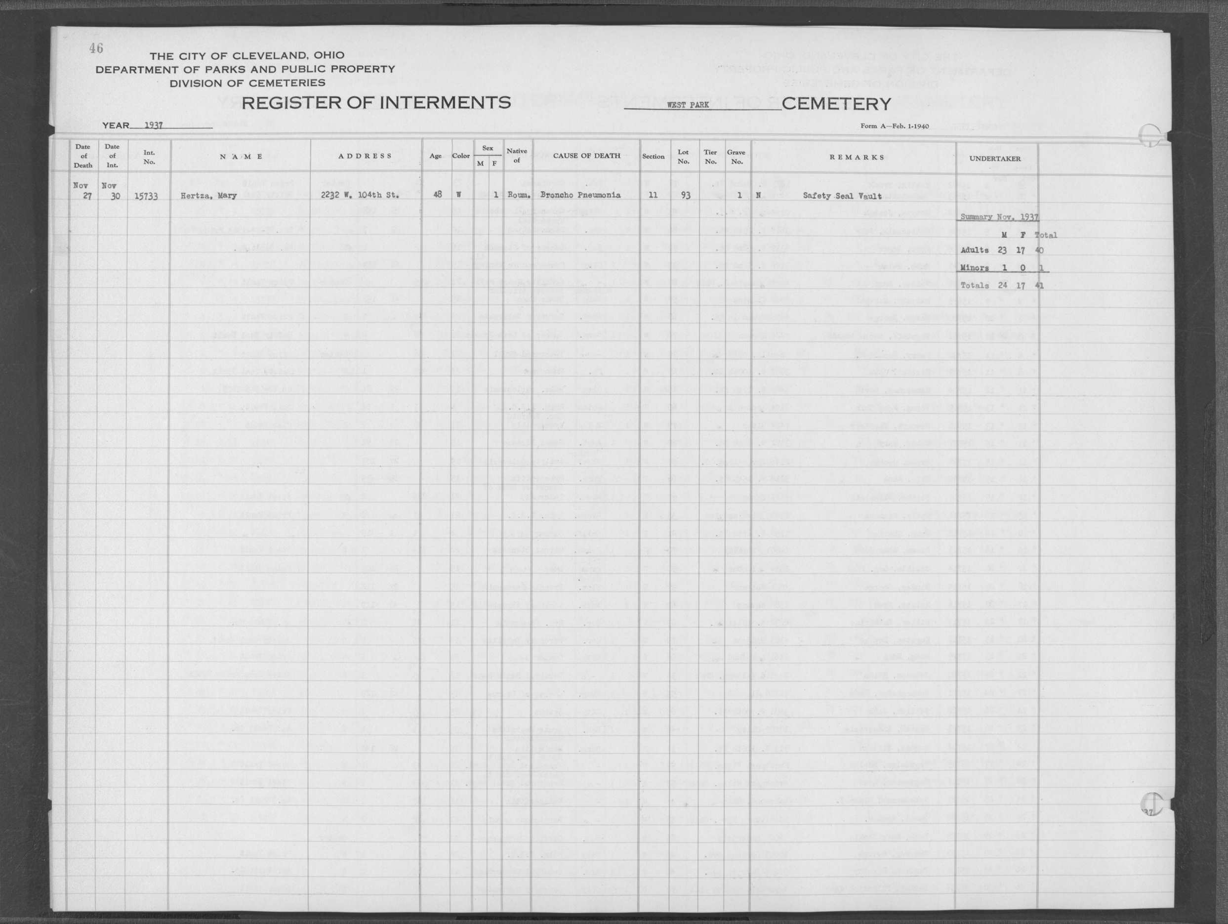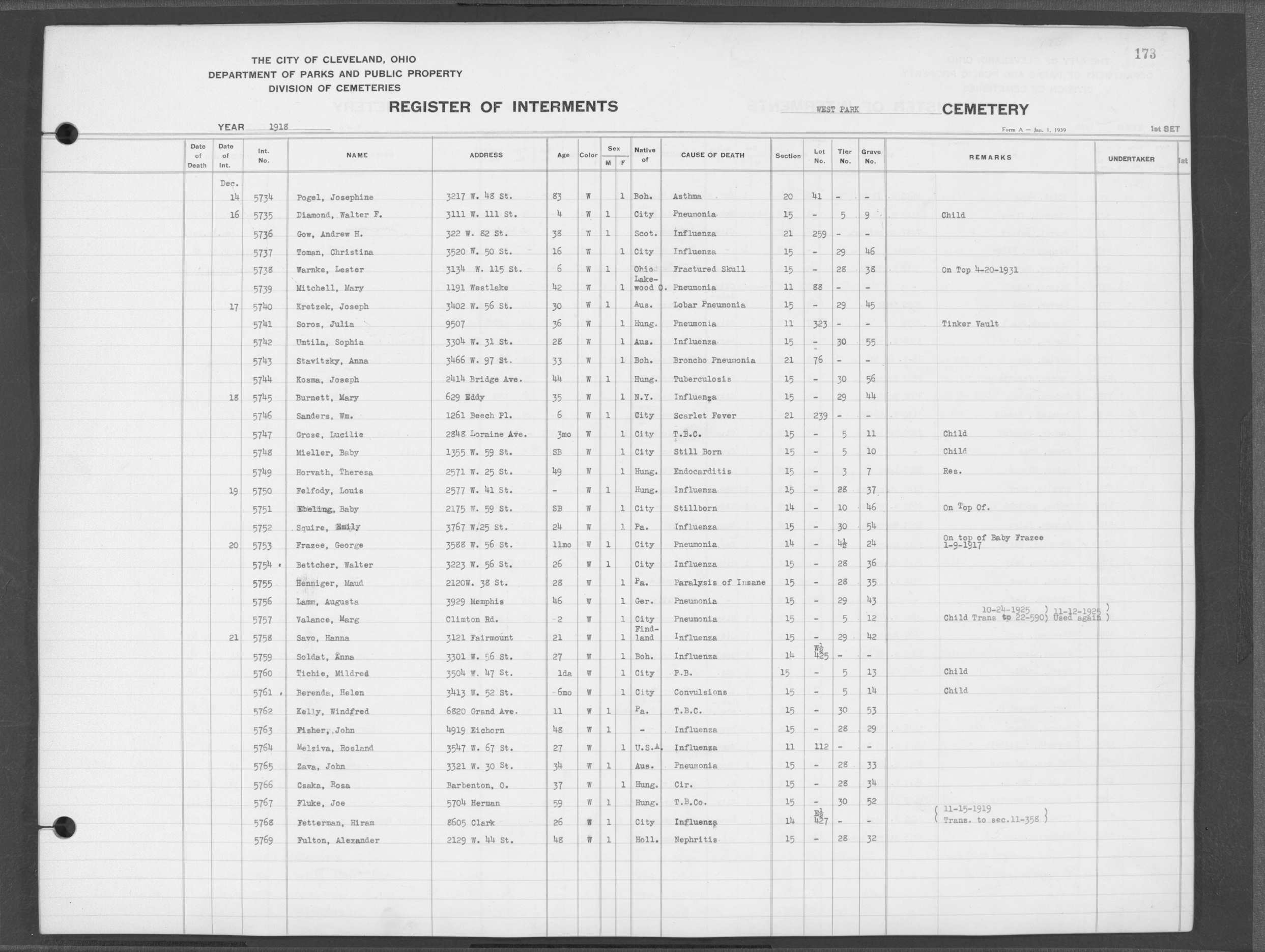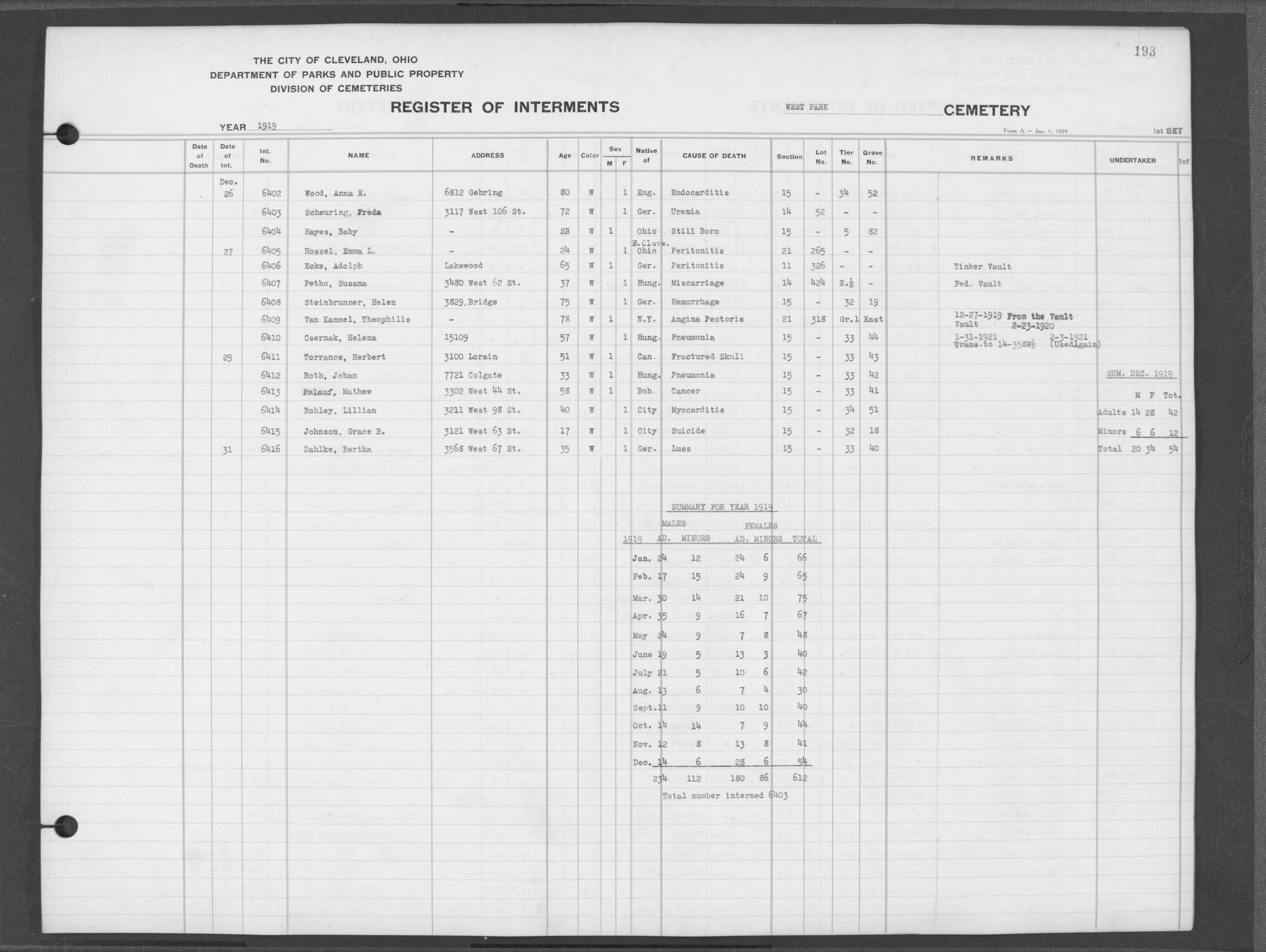 | West Park | 1 | 190 | Nov | 1 | 1919 | 6324 | Heger, Rose | 39y | W | F | ||||