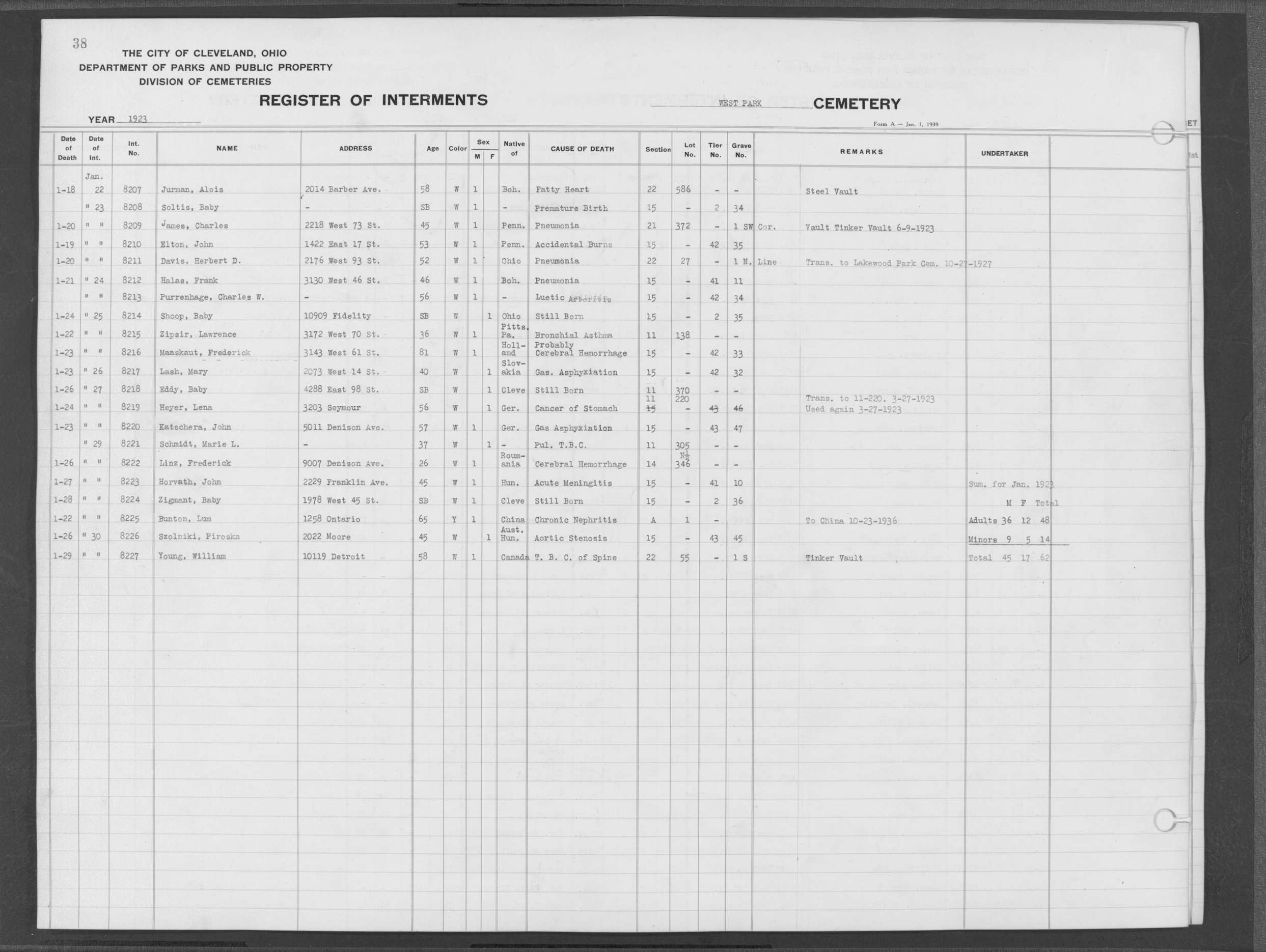 | West Park | 1 | 118 | Aug | 20 | 1915 | 3811 | Istrate, Tom | 42y | W | M | ||||