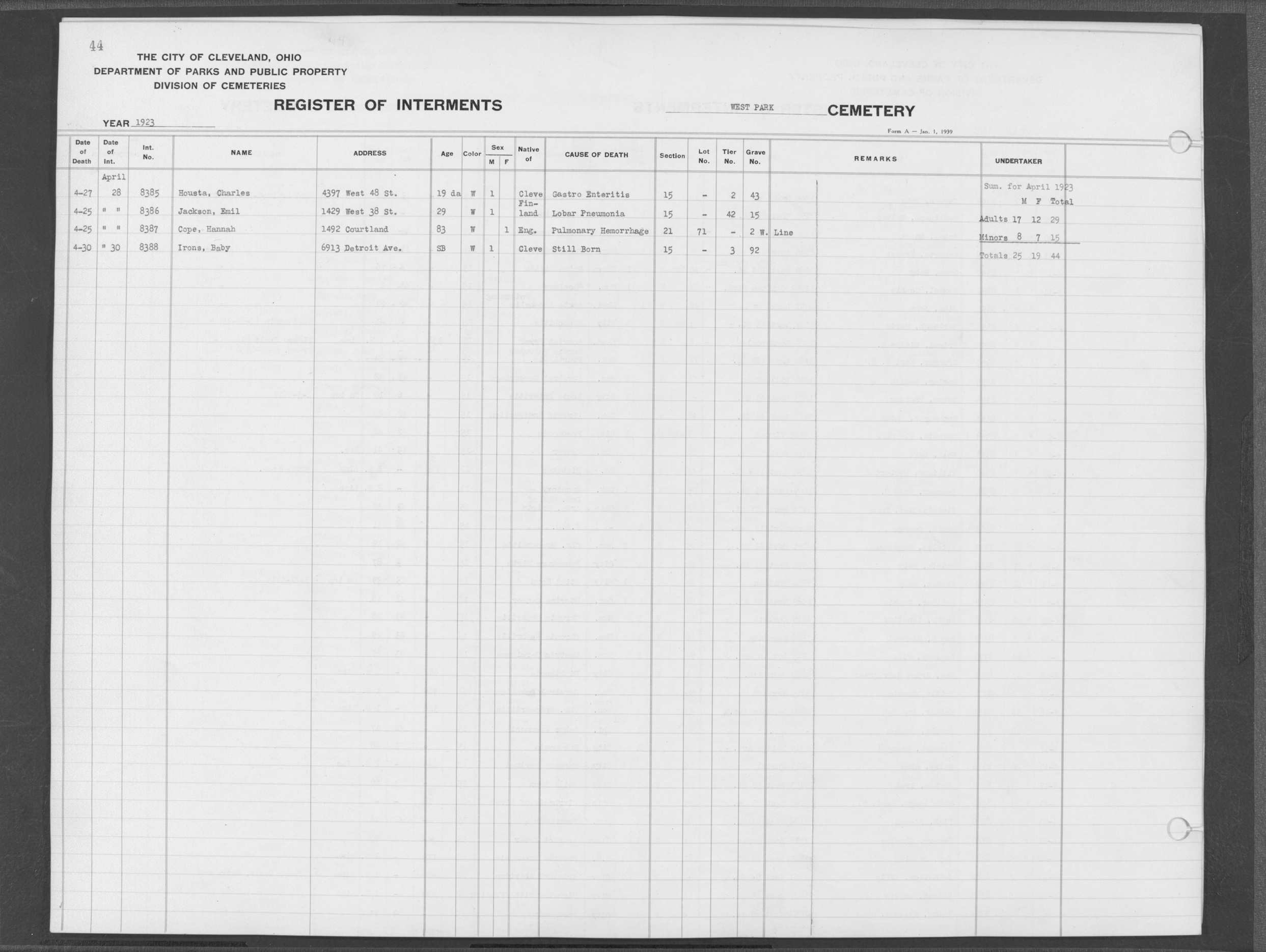 | West Park | 2 | 44 | Apr | 30 | 1923 | Apr | 30 | 1923 | 8388 | Irons, | SB | W | M | |
