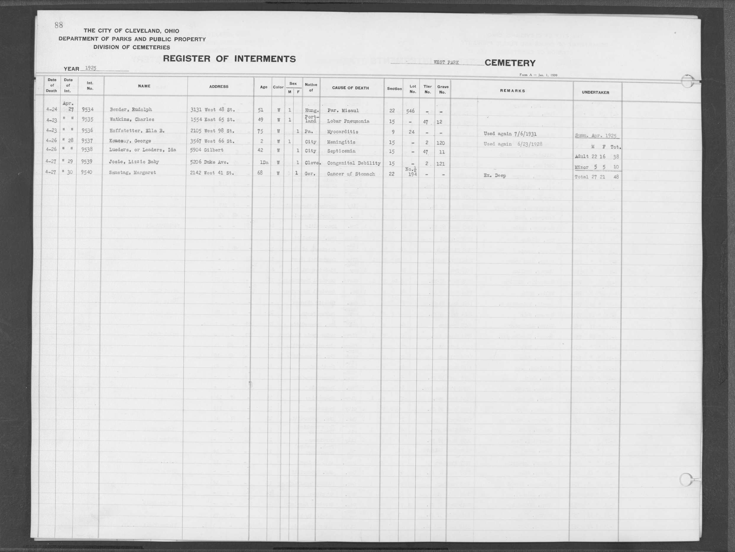 | West Park | 2 | 87 | Apr | 1 | 1925 | Apr | 4 | 1925 | 9495 | Heck, Frederick | 51y | W | M | |