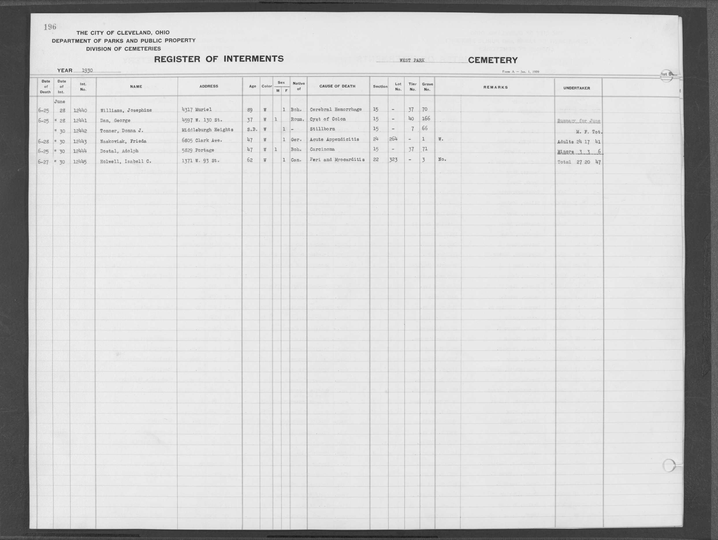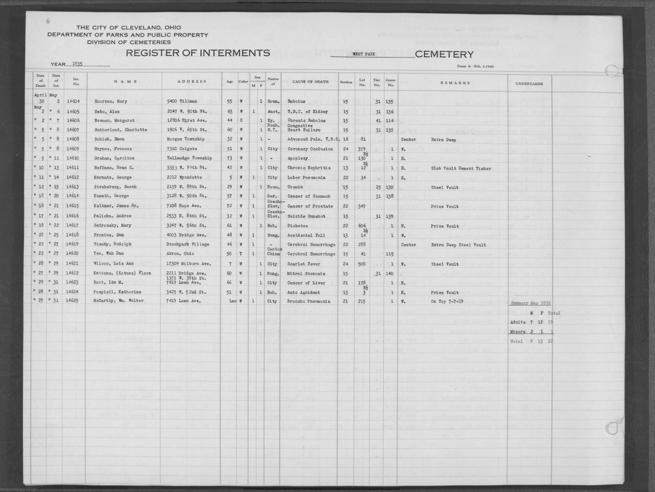| West Park | 1 | 183 | May | 20 | 1919 | 6111 | Ivasuk, Julia | 63y | W | F | ||||