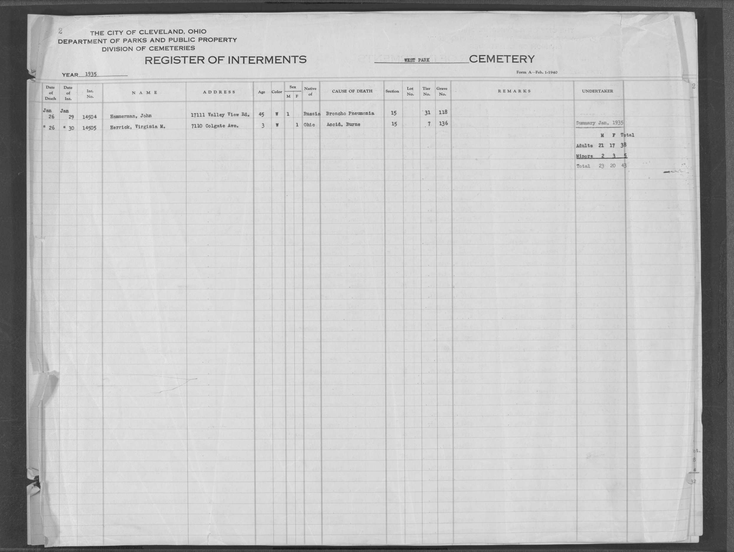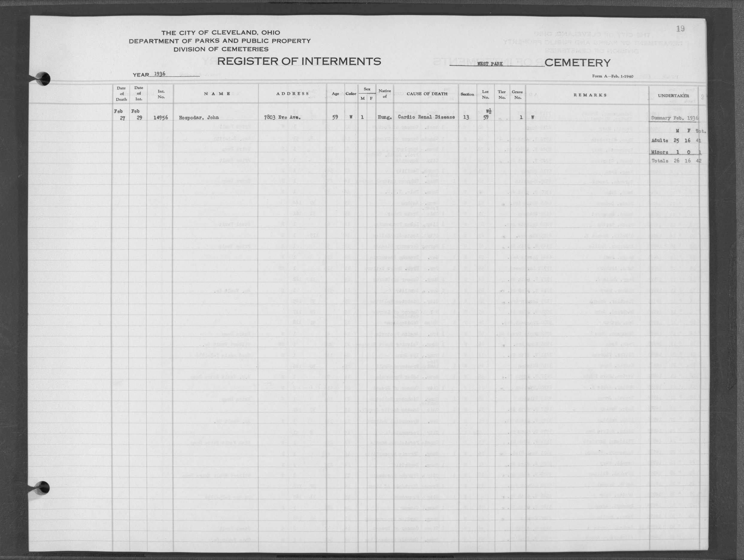 | West Park | 2 | 232 | Jun | 25 | 1932 | Jun | 27 | 1932 | 13436 | Hehn, Mathew | 37y | W | M | |