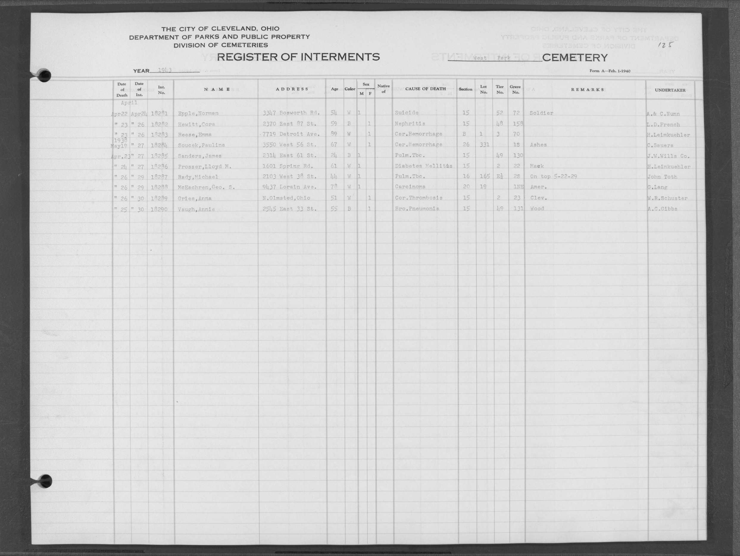 | West Park | 3 | 124 | Apr | 12 | 1943 | Apr | 17 | 1943 | 18262 | Ingraham, Edna M | 31y | W | F | |