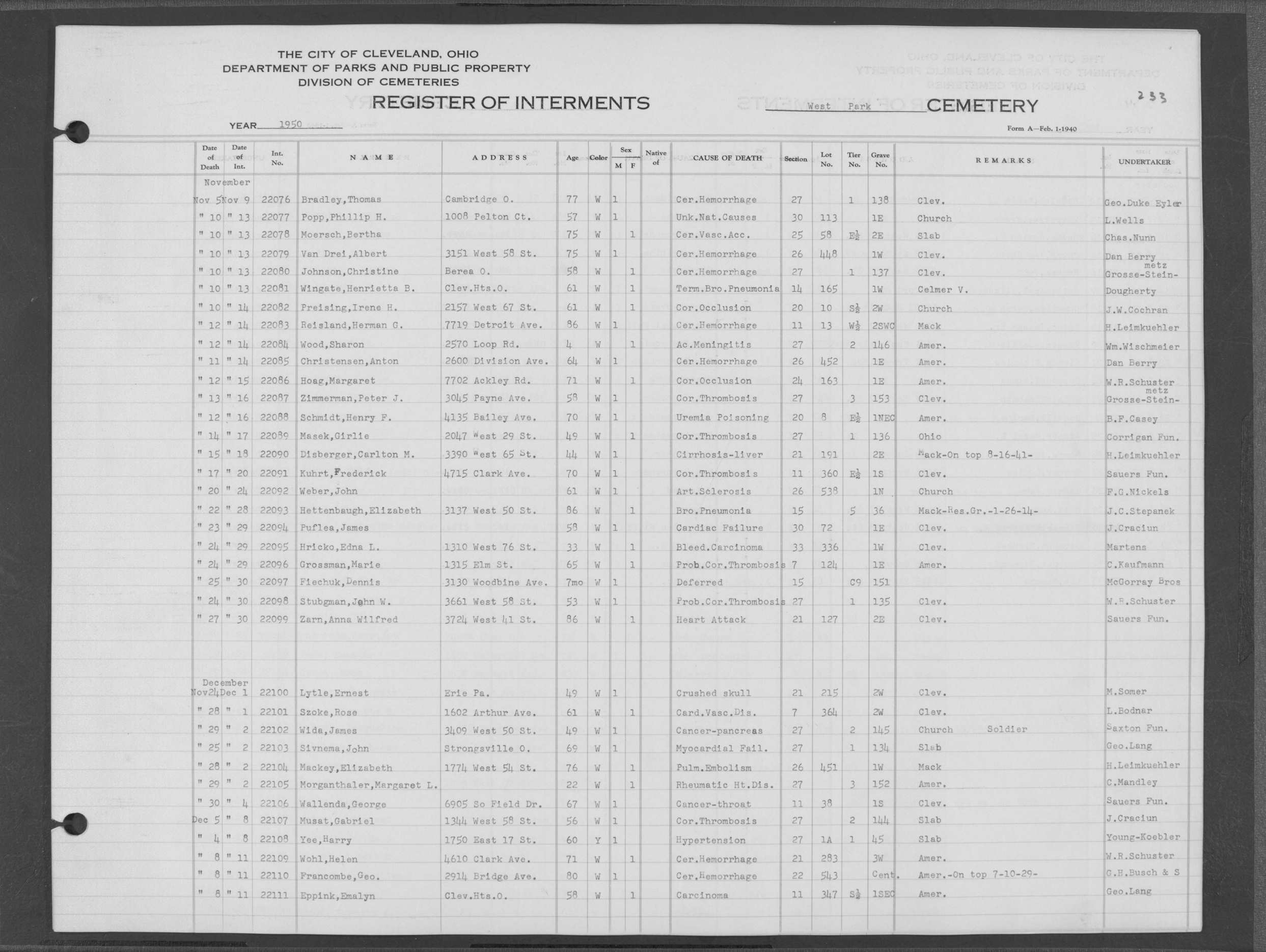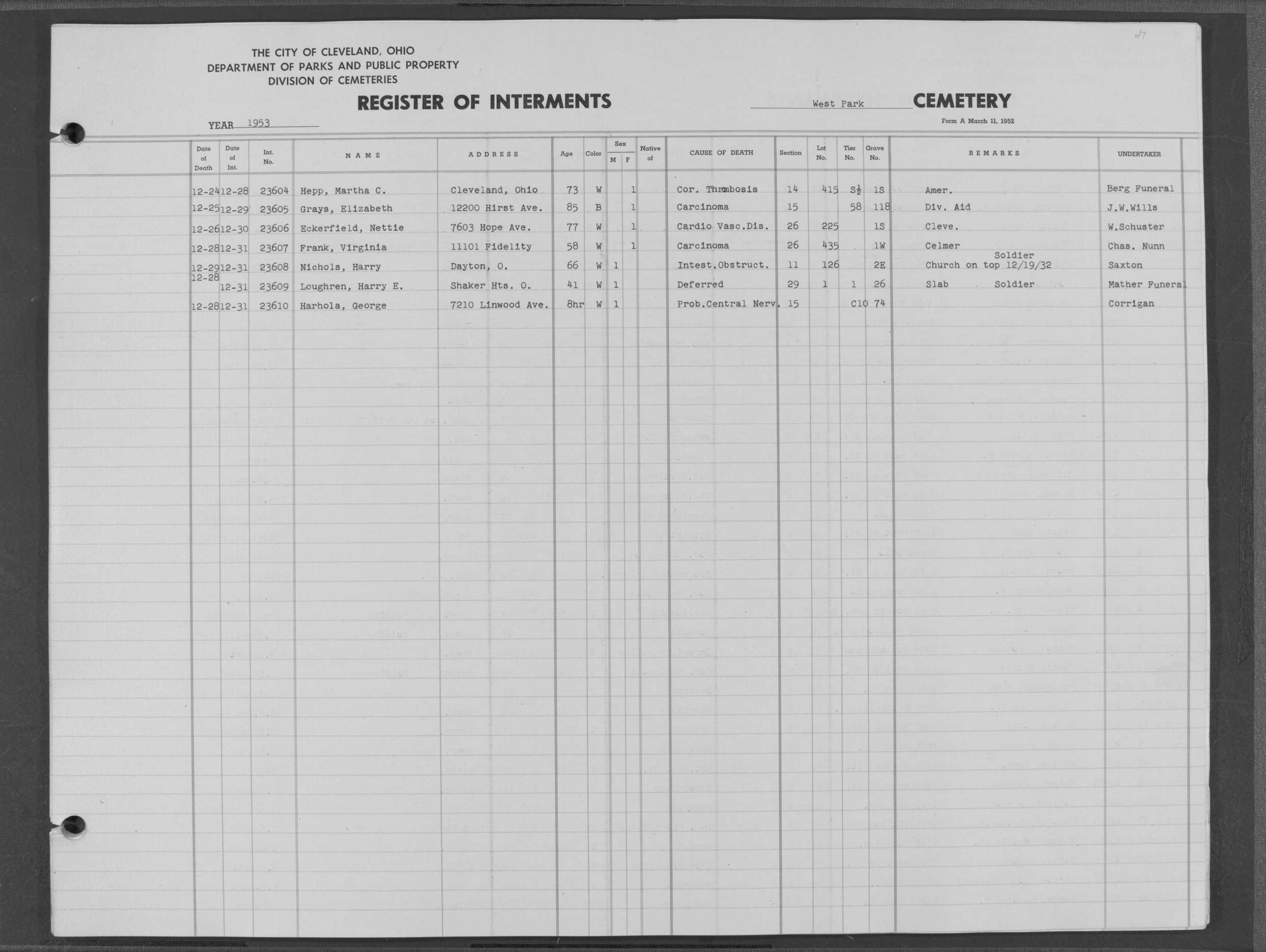 | West Park | 4 | 30 | Nov | 17 | 1952 | Nov | 20 | 1952 | 23042 | Irzsa, John | 78y | W | M | |