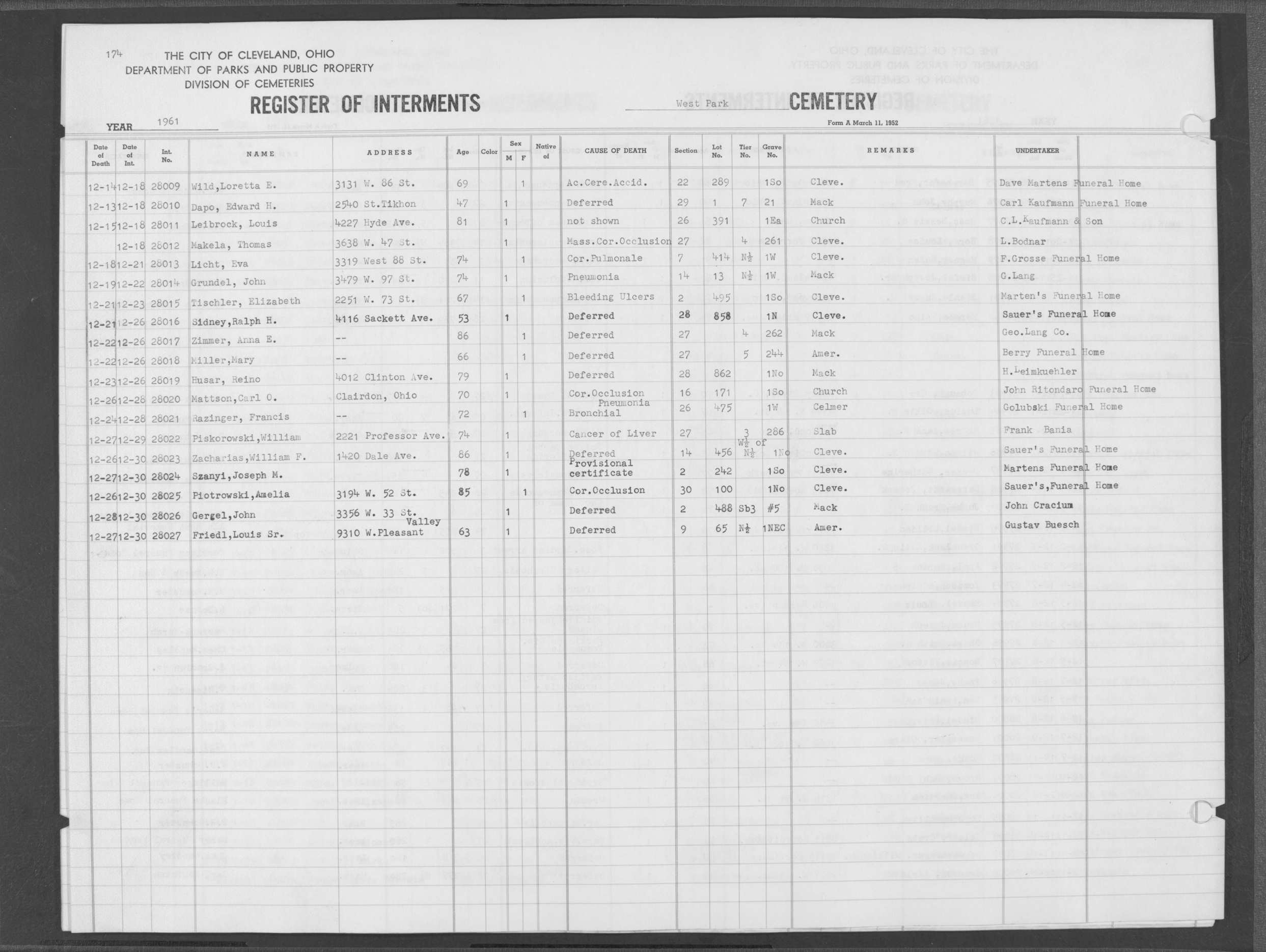 | West Park | 4 | 165 | Jun | 4 | 1961 | Jun | 7 | 1961 | 27720 | Heidl, Antoinette | 84y | F | ||