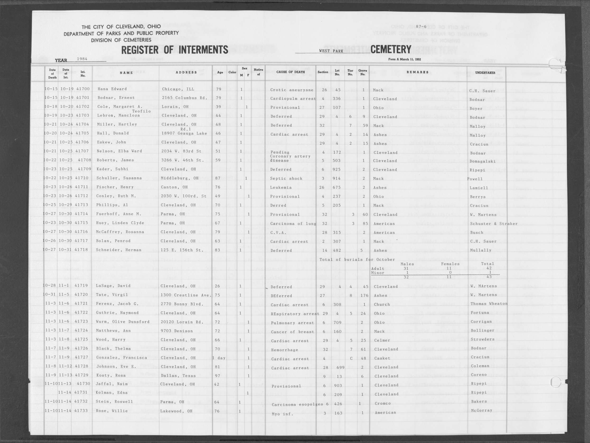 | West Park | 3 | 190 | Aug | 2 | 1947 | Aug | 5 | 1947 | 20558 | Izso, Joseph | 66y | W | M | |