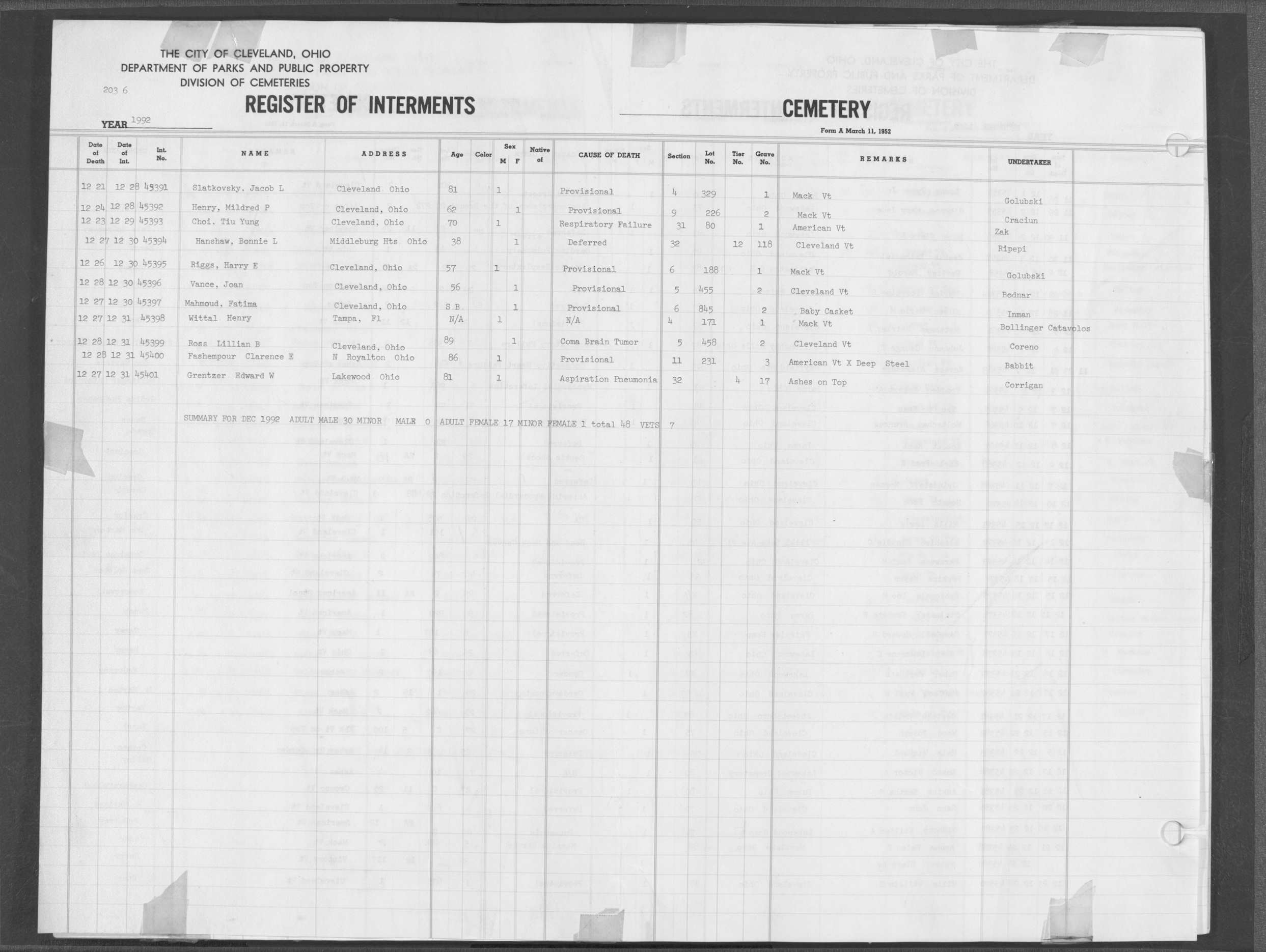 | West Park | 6 | 198 | Aug | 20 | 1992 | Aug | 22 | 1992 | 45260 | Isenhart, Laverne | 79y | F | ||