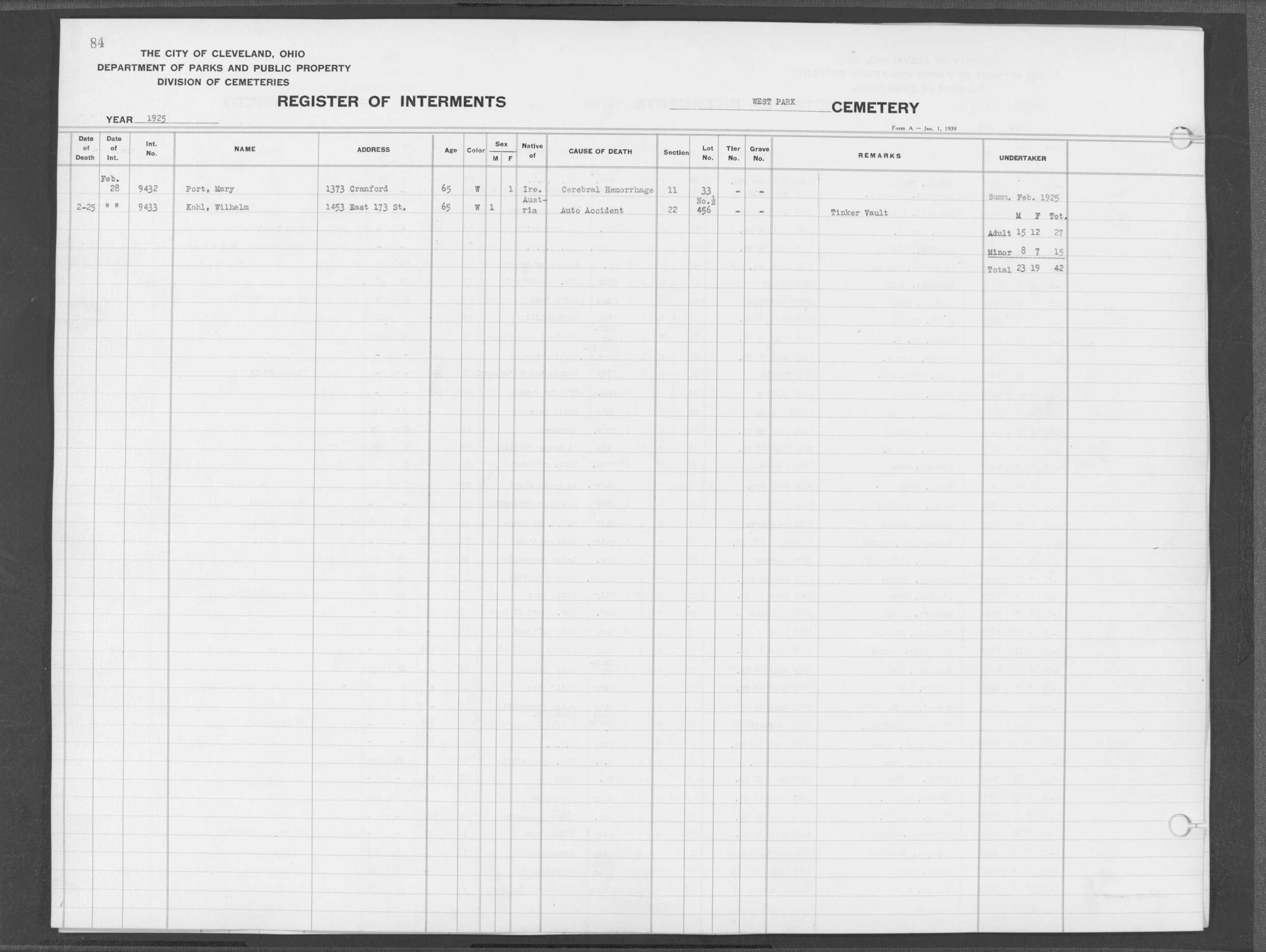 | West Park | 2 | 81 | Jan | 6 | 1925 | Jan | 9 | 1925 | 9342 | Plant, Arthur | 53y | W | M | |