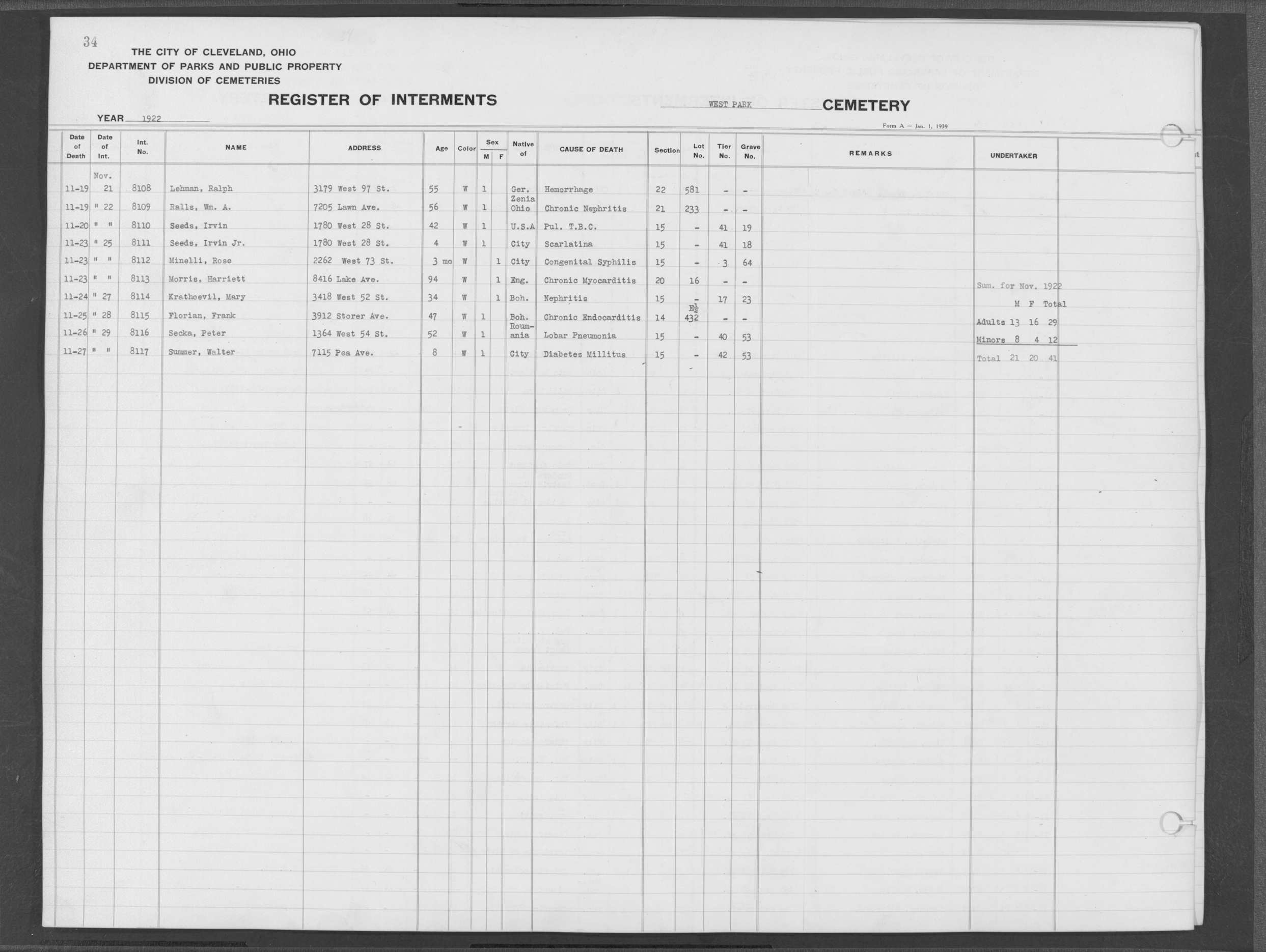 | West Park | 1 | 121 | Nov | 22 | 1915 | 3916 | Sorge, Hubert | 34y | W | M | ||||
