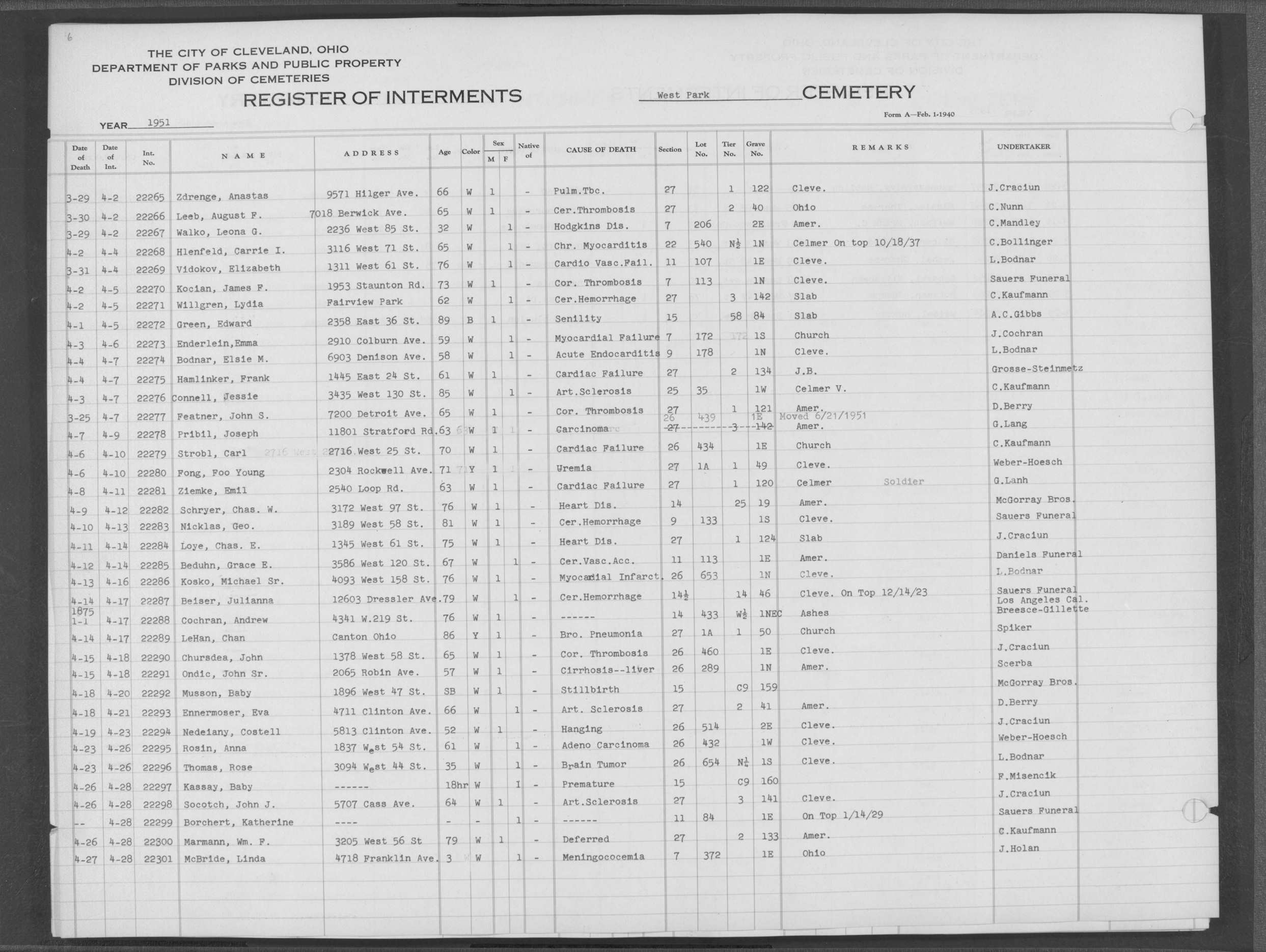 | West Park | 1 | 179 | Mar | 6 | 1919 | 5956 | Schraitle, Louis | 61y | W | M | ||||