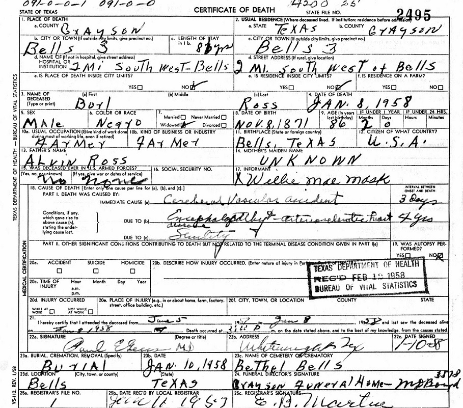 ![]() Robert Leon "Bob" Ross See his death certificate at the bottom of this page. Burl Ross 8 November 1871 - 8 January 1958 ![]() Robert Leon Ross "Bob" 25 Dec 1876 - 1 Jul 1965 Son of Al Ross Center Section ![]() Bethel Cemetery Susan Hawkins ©2025 If you find any of Grayson County TXGenWeb links inoperable, please send me a message. |