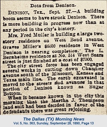 By September 1890, the Bernheim ornate, comfortable, two-story home was completed at 614 West Sears.  The Bernheim house must have been among Architect Dillery's last projects in Denison. The following February  (1891) he purchased property in Galveston (from fellow Denisonian and soon-to-be Galvestonian, Amasa Stewart, whose home at Austin Avenue and Texas Street is featured in Glimpses of Denison, Texas in 1890).