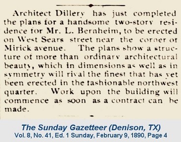 Initially the Bernheims lived at 408 West Gandy Street (1887), then at 608 West Sears Street.  The 1892 Denison City Directory lists the Bernheims at 608 W. Sears, next door to 614 on the east.  Reports in the Gazetteer tells us the directory was compiled in September 1890 and delivered around the middle of October. The canvassers must have found the Bernheims living next door to their new house only days before they moved into it.  Plans for the 2-story residence for Mr. L. Bernheim and family were drawn up by architect Samuel C. Dillery, who had just completed the Bloomfield Academy across the Red River.  Construction began In February or March 1890.