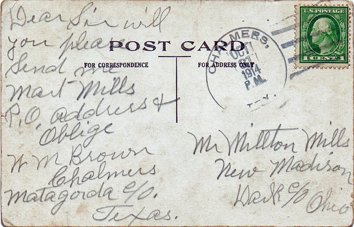 J. H. Davis was a caller at Bay City Wednesday. Will Hale and C. Laxton moved their threshing outfit to Collegeport Thursday. They have quite a large contract there. Mrs. H. H. Fell spent Friday with Mrs. Chas. Tew at Bay City. Mr. and Mrs. F. Harper went to Collegeport Saturday to spend several days visiting relatives. F. R. Curtis and daughter, May, left here Saturday to spend a few days at Gueydon, La., before returning to their home at Blufton, Indiana. Miss Johnie May Myers, of Uvalde, Texas, arrived here Saturday. She will begin her school Monday. County Superintendent, Lewis has been having the school house overhauled put in first class condition. Mrs. Waldron, of Bay City, spent Sunday with Mrs. Sam Kennedy. Mable Kennedy is visiting Lucile Ladd at Bay City for a few days. Mrs. Horace Fell spent Monday at Rosenberg. Mrs. Will Hale and Mrs. H. Anderson were shopping at Bay City Monday afternoon. Mrs. B. T. Curry visited at the County Seat Tuesday.