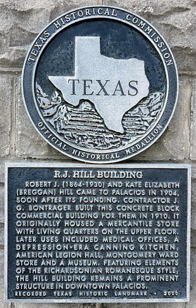 The Texas Historical Marker for the R. J. Hill Building was dedicated October 28, 2001. The R. J. Hill Building is on the corner of Fourth and Commerce Streets, Palacios, Texas.