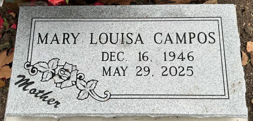 Mary Louisa Campos, 78, of Brookshire, Texas passed away May 29, 2025. She was born December 16, 1946 in Bay City, TX to the late Elec M. Garza and Sarah Garcia Garza. In addition to her parents, she was preceded in death by a brother, Alex Garza, Jr. Survivors include her husband Ruben Campos; daughter Michele Campos; son Ruben Campos, Jr. (Amber); sister Melba Garza; brothers Jimmy Garza, Ezekiel Garza, Danny Garza and Clem Garza and grandchildren Morgan Campos, Alexis Sunderland, Garrison Campos, Joshua Campos, Andrew Grenier, Avery Grenier, Charleigh Laenger and Linden Roberts. Visitation will begin at 9:00 AM Thursday, June 5, 2025 at Our Lady of Guadalupe Catholic Church. Funeral Mass will be at 10:00 AM with Rev. Gabriel Espinosa officiating. Interment will follow at Cedarvale Cemetery. Pallbearers will be Ruben Campos, Jr., Matthew James Donham, Andrew Grenier, Garrison Campos, Joshua Campos and Ezekiel Garza, Jr. Taylor Bros. Funeral Home Photo courtesy of Faye Cunningham