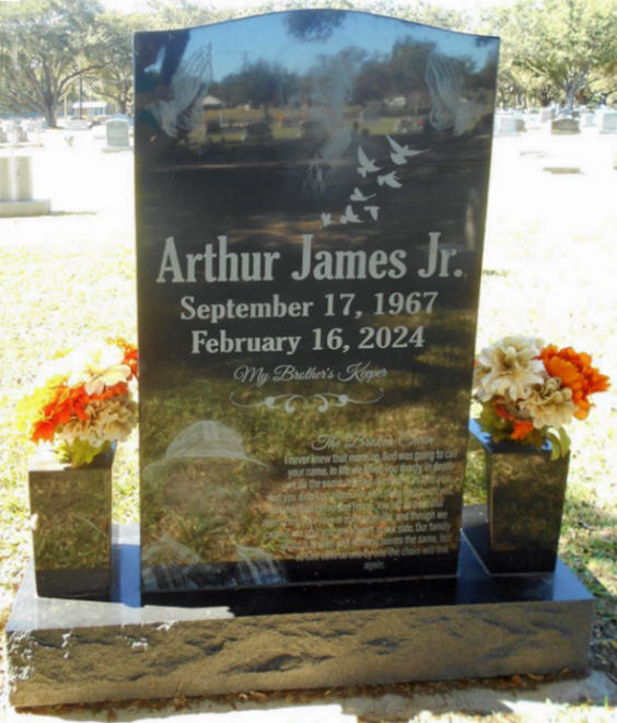 Arthur James Jr., 56, of Bay City, Texas, was born on Sunday, September 17, 1967, in Bay City, Texas, to Arthur James Sr. and Ernestine Bonner James, and passed away on Friday, February 16, 2024, in Houston, Texas. Visitation and guest book registry will be on Friday, March 1, 2024, from 2 p.m. until 7 p.m. at the Duncan-Roberts Funeral Home Chapel in Bay City, Texas. Funeral services will be on Saturday, March 2, 2024, at 11 a.m. at Enterprise Baptist Church in Bay City, where Rev. C. Donnell Wallace is Pastor and Rev. K. W. Bree, eulogist. Burial will follow at Eastview Cemetery in Bay City. Survivors include his loving family and many friends. Arrangements with Duncan-Roberts Funeral Home, Bay City, Texas; 979-245-5197. Bay City Tribune, February 28, 2024 Marker photos courtesy of Faye Cunningham
