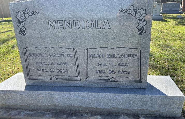 Gudelia M. Mendiola, 89, of Bay City, Texas, passed away Friday, December 6, 2024. She was born December 25, 1934, in Bay City to Eusebio Martinez, and Guadalupe Perez Martinez. Mrs. Mendiola retired from Gordon’s Wholesale and Refrigeration after many years as a bookkeeper. She also served as a volunteer bookkeeper for Our Lady of Guadalupe Catholic Church. Gudelia was a devoted New York Yankees fan. Cooking and trying new recipes as well as sewing were some of her interests. She was preceded in death by her parents; and brothers Norberto, Pedro, Raymond, Domingo, Sylvestre, Joe and Stephen Martinez as well as sisters Florence M. Torres, Fausta, Guadalupe, Teresa and Janie Martinez. She is survived by her loving husband, Pedro Mendiola; sisters, Mary M. Alvarez and Esther J. Martinez along with numerous surviving nephews, great-nephews, niece and great-nieces which were her love. Her God was her strength. She was a devout rosary warrior. The family will receive relatives and friends for visitation from 5-7pm Monday, December 16, 2024, at Taylor Bros. Funeral Home with the Holy Rosary being recited at 6:30pm. Mass of Christian Burial will begin at 10:00am Tuesday, December 17, 2024, at Our Lady of Guadalupe Catholic Church with Reverend Gabriel Espinosa officiating. Interment will follow at Cedarvale Cemetery in Bay City. Pallbearers for Mrs. Mendiola will be Esteban Martinez, Steven R. Martinez, Stephen A. Martinez, Dominick Martinez, Nicholas Eusebio Martinez and Daniel Alvarez. Honorary Pallbearers: Raymond Martinez, Stephen Martinez, Faustino M. Torres, David Alvarez, Lino Ramirez, Rodney Trevino and Roland Zarate. Bay City Tribune, December 15, 2024 Photo courtesy of Faye Cunningham