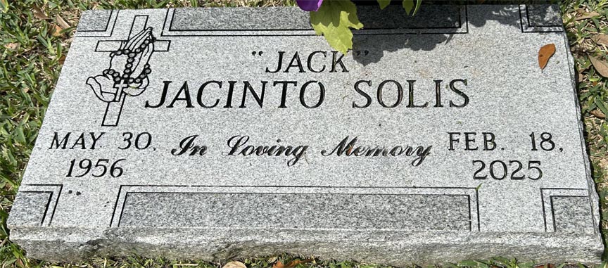 Jacinto “Jack” Solis, 68, of Bay City, TX passed away February 18, 2025. He was born May 30, 1956, in Bay City, to the late Antonio Solis and Irene Arsola Solis. Jack is survived by his daughter Christina Teets; sons Jacinto Solis and Isaac Limas; sister Esther Solis; brothers Ruben Solis, Robert Solis, and Richard Solis; 14 grandchildren and 9 great-grandchildren. The Rosary will be held at 9:30 am Tuesday, February 25, 2025, at Our Lady of Guadalupe Catholic Church. Funeral Mass will begin at 10:00 am with Fr. Gabriel Espinosa officiating. Interment will follow at Cedarvale Cemetery in Bay City. Pallbearers are Joshua Solis, Noel Solis, Richard Rodriguez, Jacinto Solis III, David Solis and Michael Solis. Taylor Bros. Funeral Home Photo courtesy of Faye Cunningham