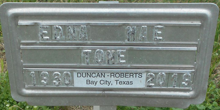 Edna Lee Bonner Tone, 88, of Bay City, Texas passed away on June 4, 2019, in Bay City. She was born in Bay City, Texas on November 27, 1930 to Willie Bonner and Johnnie Mae Fisher Bonner. Funeral services will be held Saturday, June 8, 2019 at 11 a.m. at Enterprise Baptist Church in Bay City. Burial will follow at Eastview Cemetery in Bay City. Her two daughters, Elizabeth Meurer and Charlene Godley; and an enormous family of other relatives and friends, survive her to cherish many loving memories. Arrangements with Duncan-Roberts Funeral Home, Bay City, Texas; 979-245-5197. Bay City Tribune, June 12, 2019 Photo courtesy of Faye Cunningham