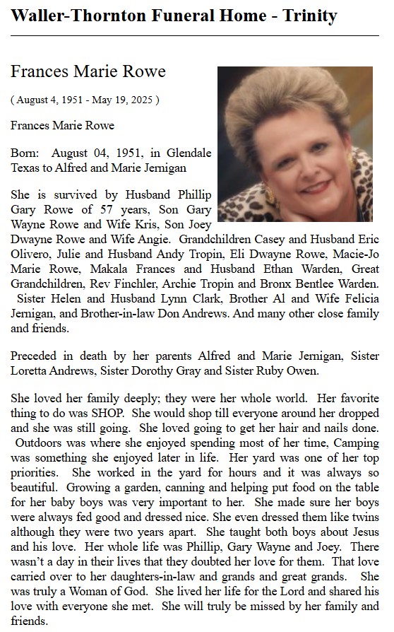 | RUSHING | Cheryl Jones | Waller Thornton Funeral Home | 1/20/2024 | |