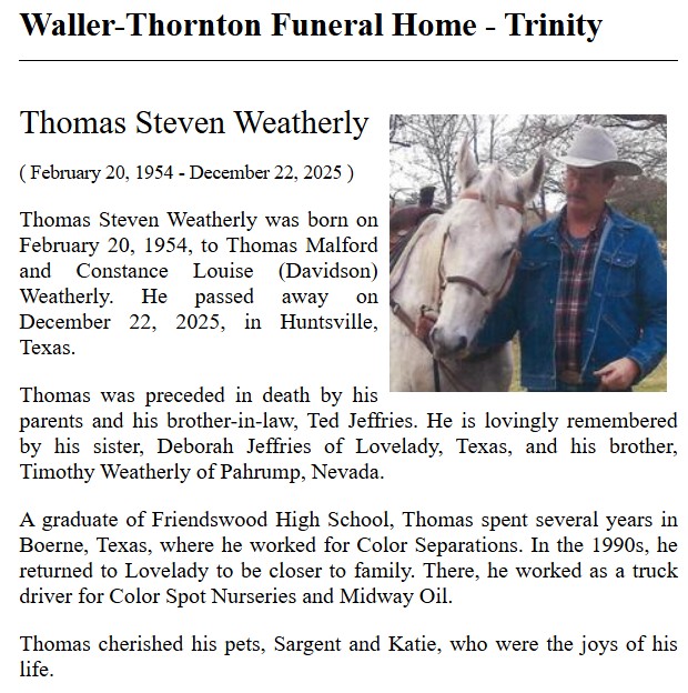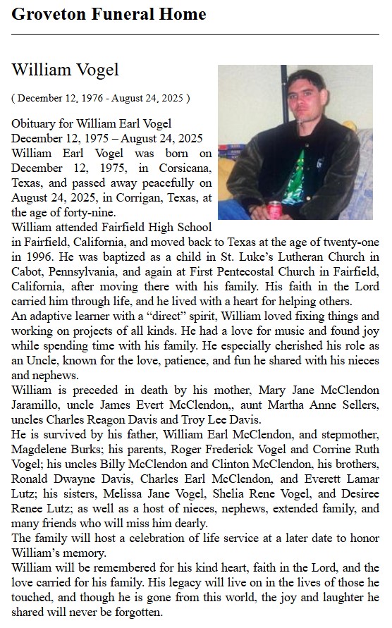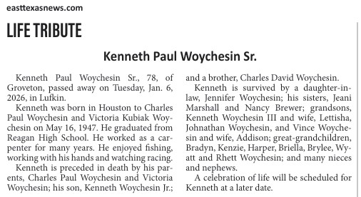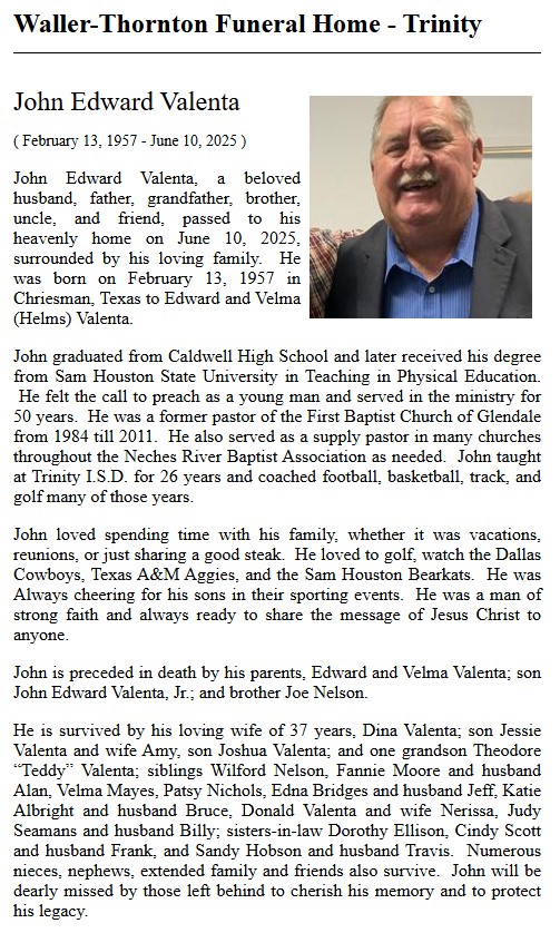| VANACEK | Joe Wayne | Trinity County News Standard | 11/21/2019 |