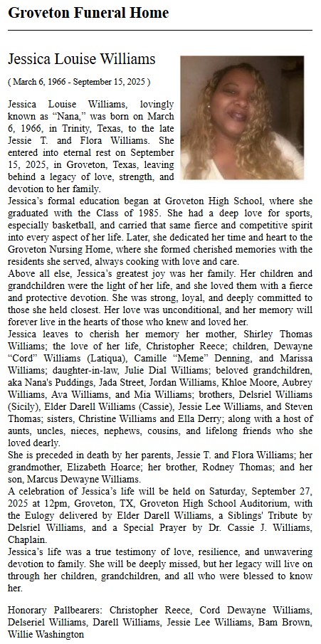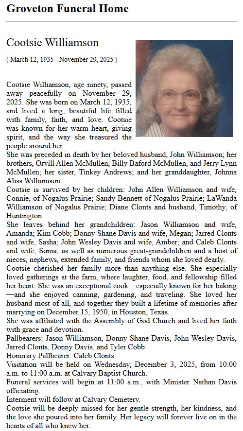 | VAN | Betty Jo Cook | Groveton Funeral Home | 7/12/2016 |